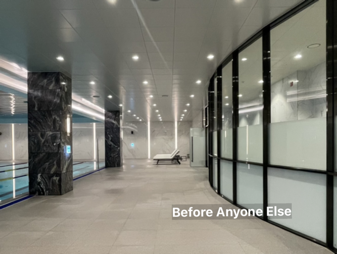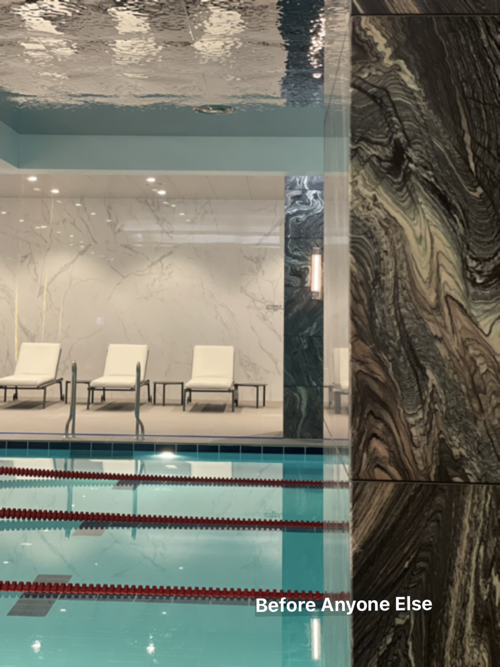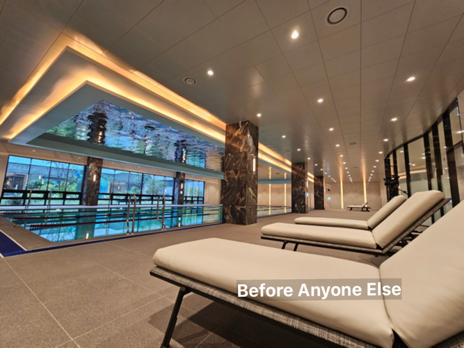 화려함을 위해 선택한 베르데루아나 대리석은 유니크함을 표현할뿐더러 하드리안스는 로마에서 왔듯이 이태리에서 온 대리석이랍니다. 크리스털 벽등은 기둥의 화려함을 더하고 다소 차가운 수영장을 온화한 무드로 만들어 주고 휴양지 감성을 전달합니다.