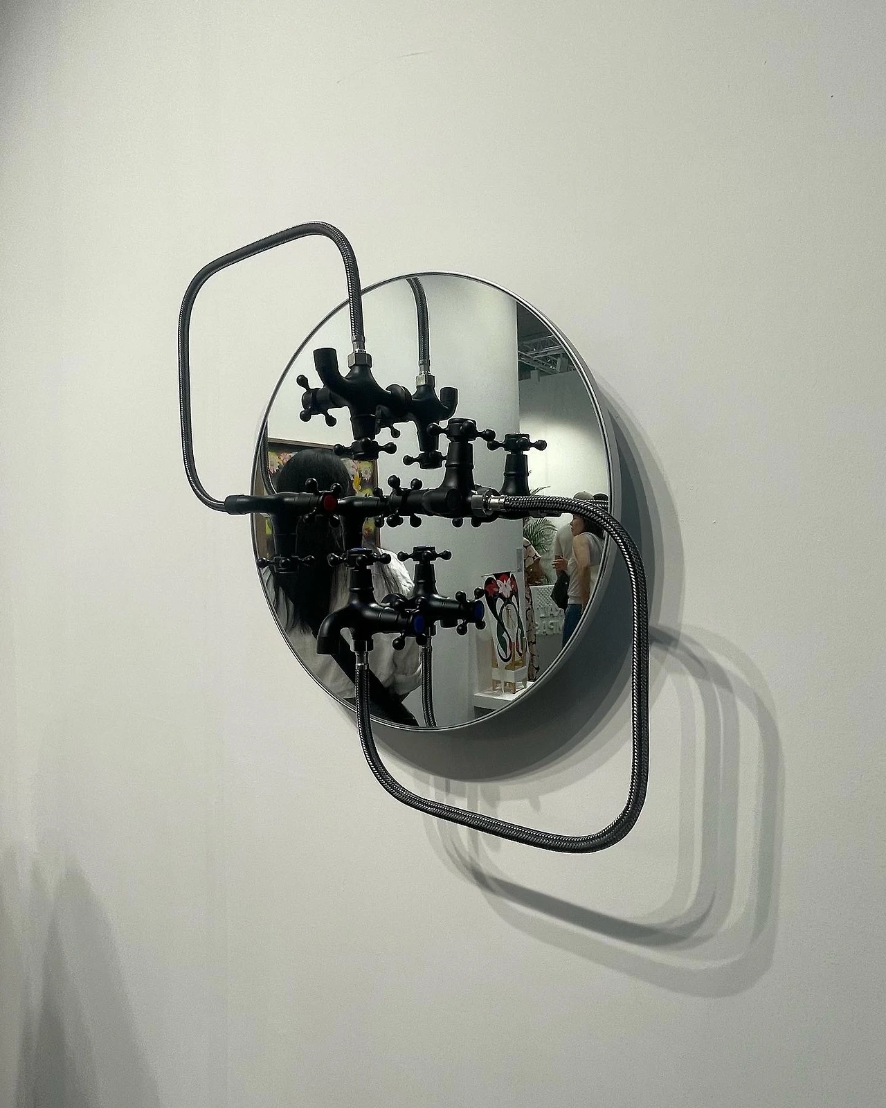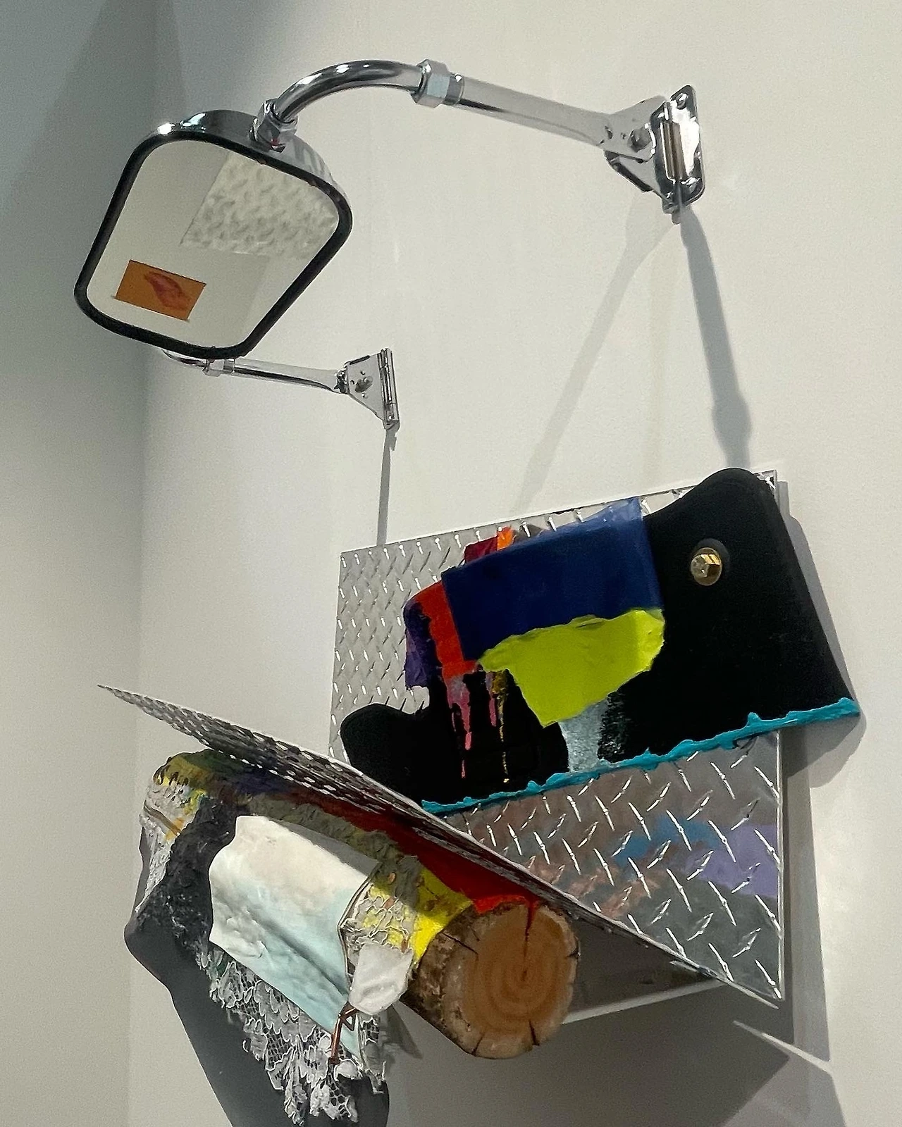 자동차 폐차장애서 주워온 것 같은 거울과 건축현장애서 쓰고 남은 자재들을 모아 재구성한 듯한 작품입니다. 버려지는 물건도 아름다움을 주는 대상이 되는 반전을 느낍니다. 거울은 환경을 생각해 보라는 메시지를 주는 통로인 것 같기도 합니다.