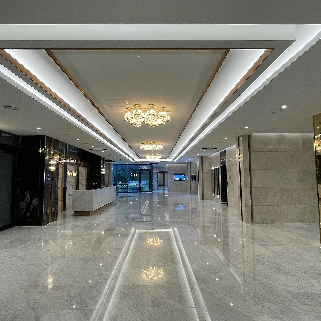 로비 천정 디자인의 여러 요소 중 분위기의 핵심은 샹들리에 조명입니다.