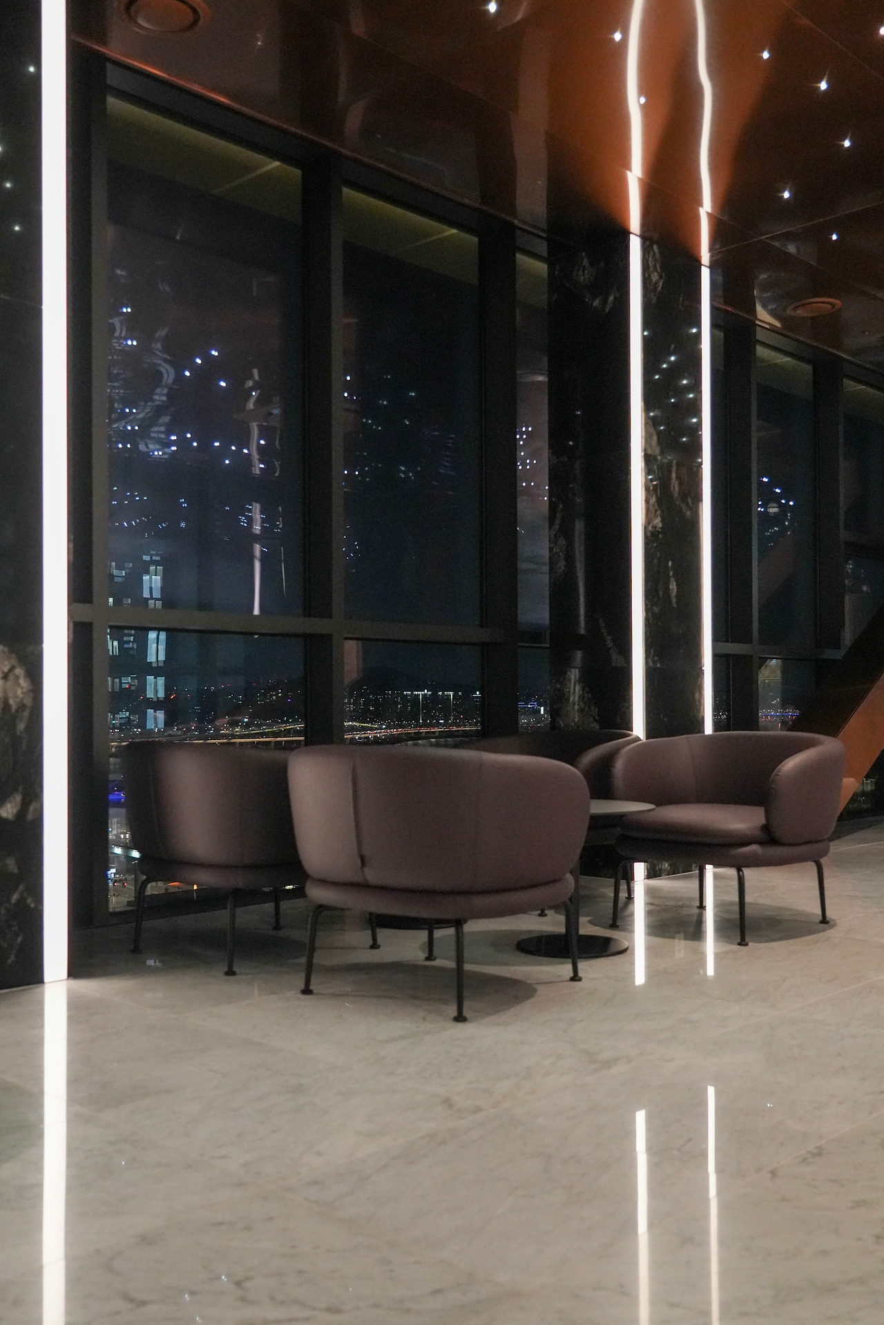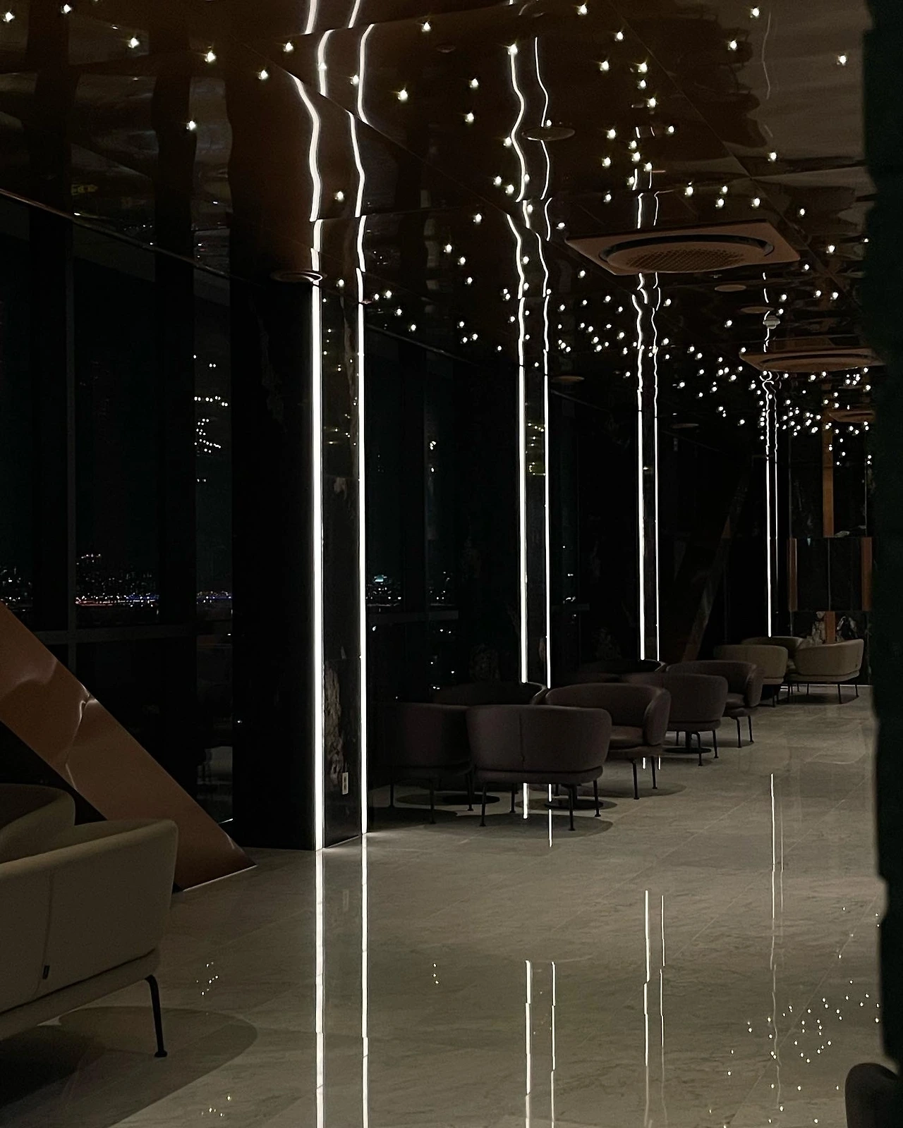 밤하늘을 상징하는 브라운 천정까지 뻗어 올라가는 라인조명의 아우라는 지상에서 올려다볼 때 가장 제격입니다. 지난 몇 달 동안 수없이 바라보며 밤과 낮, 기둥의 조명이 켜지고 꺼졌을 때 지상에서 바라보는 느낌을 경험해 보며 찾아낸 제 결론입니다.