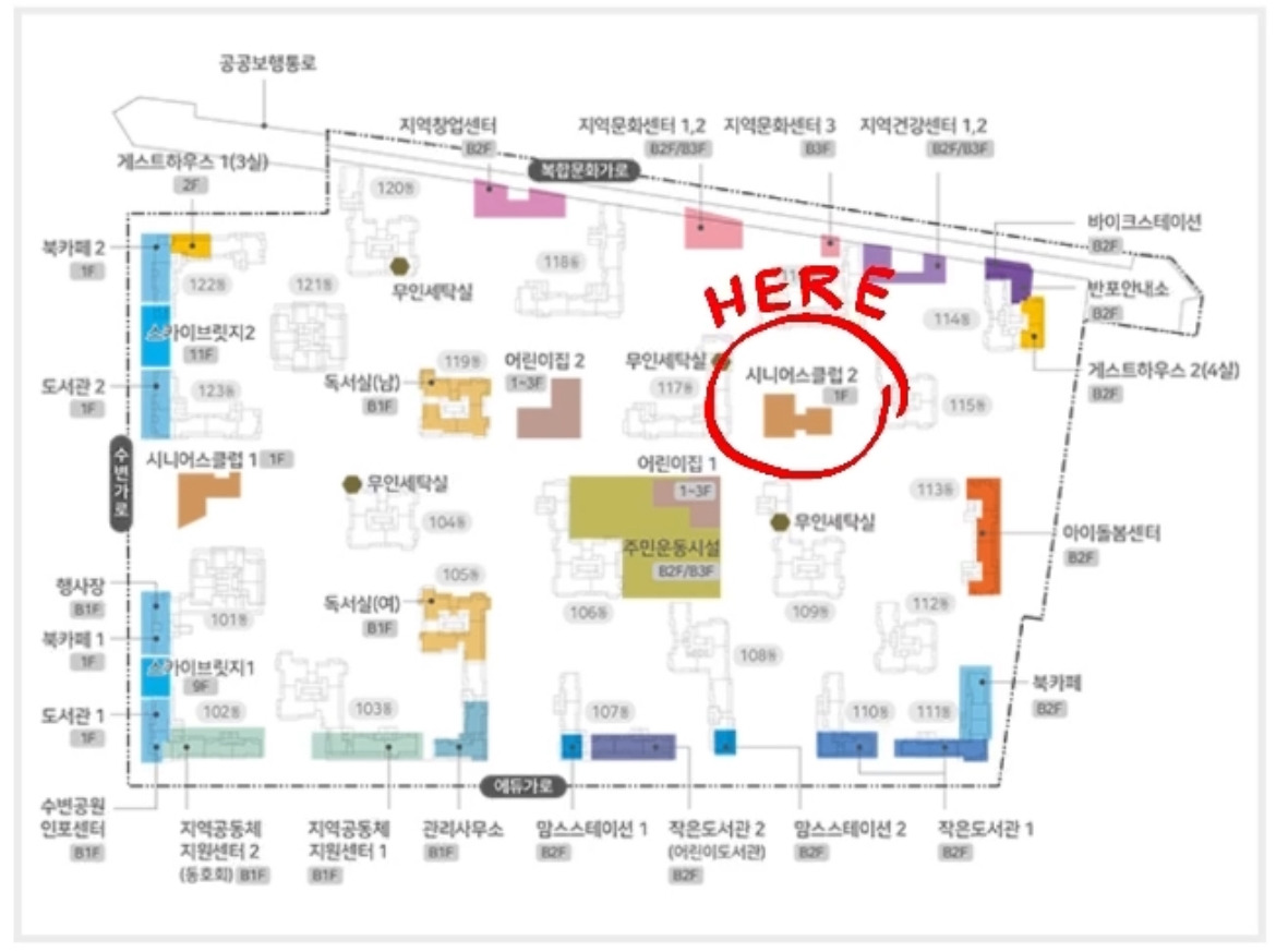 단지 안에는 2개의 시니어클럽이 있습니다. 그중 시니어클럽 2에 위치해 있습니다.