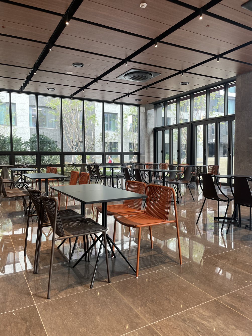 이동식 가구인 테이블과 의자는 오픈 일정에 즈음하여 세탕을 완료했습니다. 그린컬러 포인트에 맞는 연한 그린컬러 의자에 오렌지컬러를 보색으로 포인트로 배치하여 생동감을 주고 있습니다. 외부와 연계된 공간이므로 아웃도어 스타일의 가구를 컬렉션 하여 내외부를 연계한 디자인을 완성하고 있습니다.