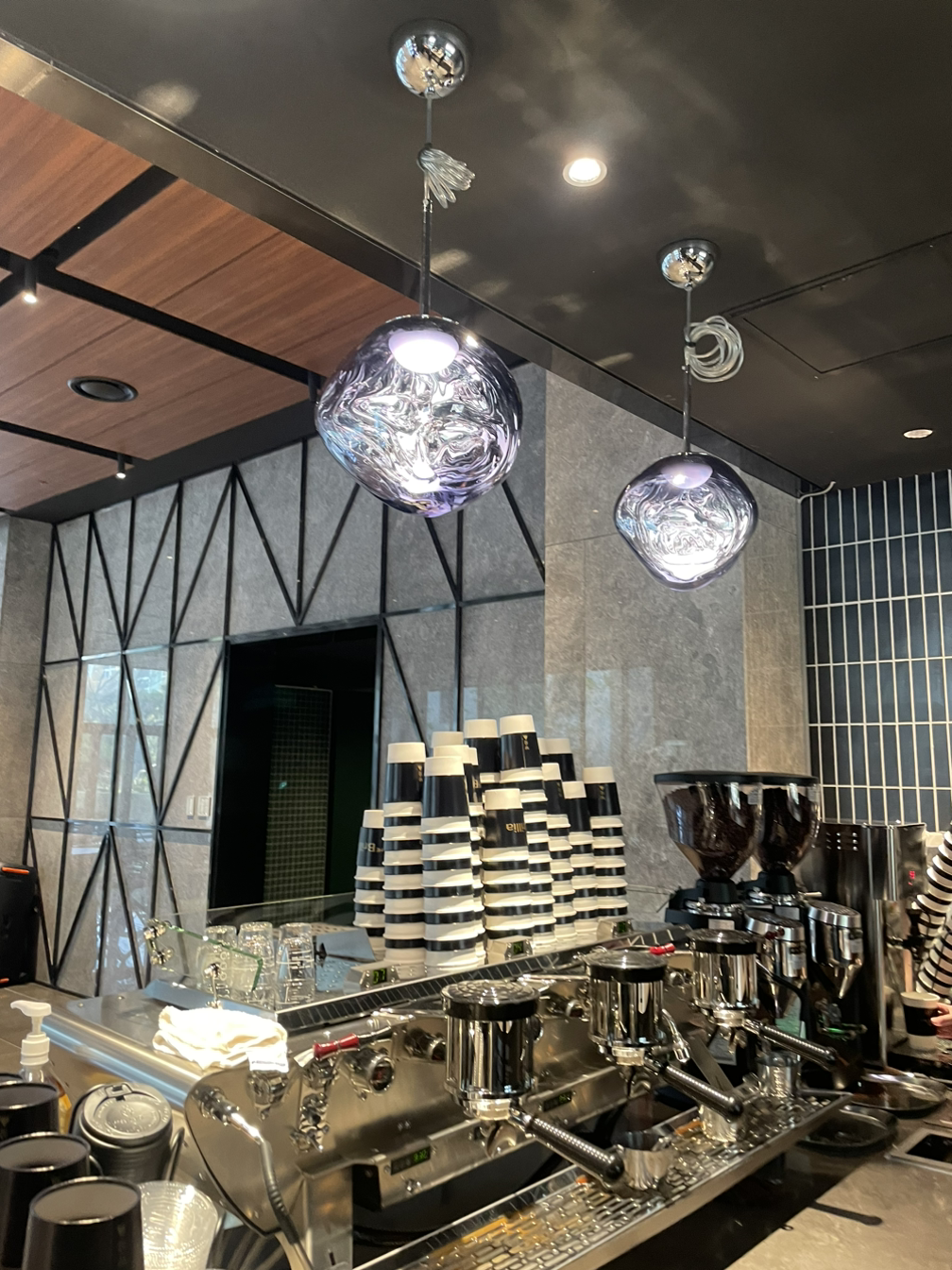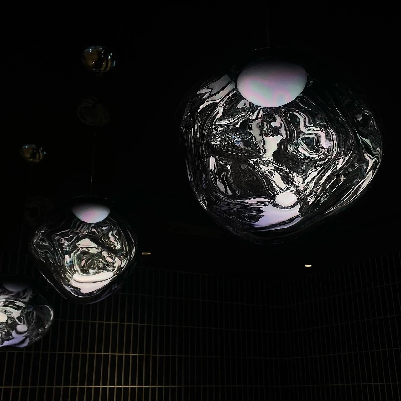 카페바의 오브제 펜던트는 영국 탐딕슨사의 제품인 Mellt 컬렉션으로 추억과 현재가 경계 없이 바라보는 통로이자 공간의 무드를 표현합니다. Melt만의 특별한 제작 공정으로 왜곡시킨 구형 조명의 유리표면은 공간의 무드를 압도합니다. 금속화된 시각 효과로 천상의 광채를 발산하는 매력이 그러합니다.