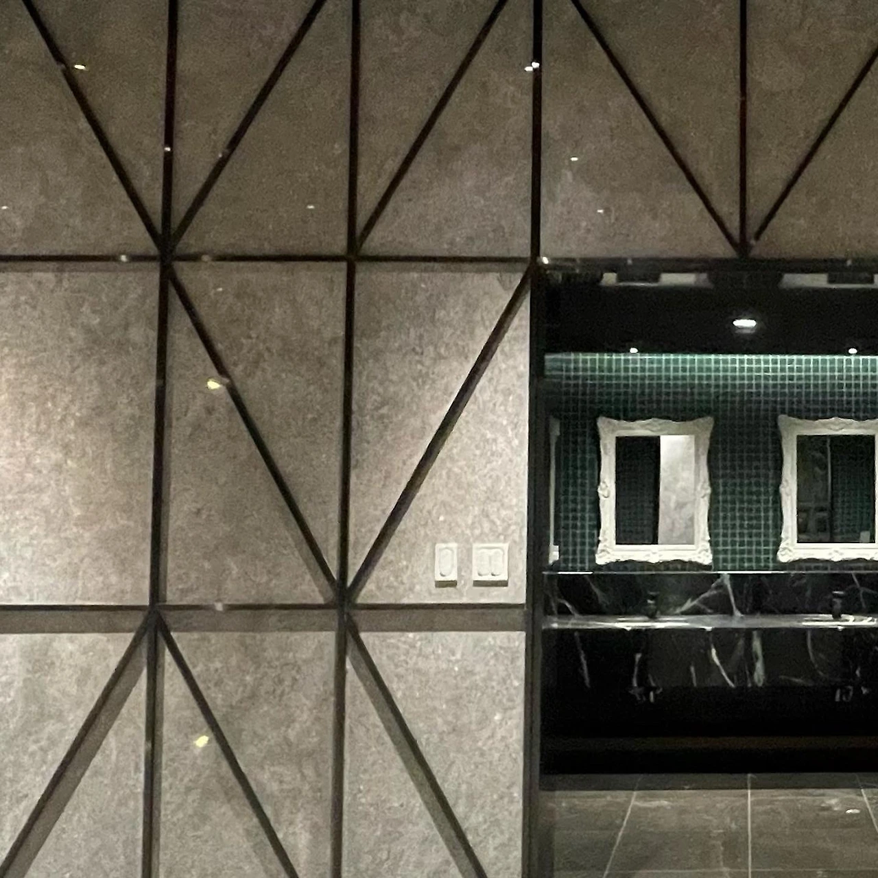 화장실 파우더 공간의 거울은 시간의 중첩을 담았습니다. 빈티지 스타일 거울 프레임으로 지나간 여행의 흔적을 의미하고, 화이트컬러는 현재의 일상을 의미합니다. 그린컬러의 타일과 사선패턴의 금속장식은 파인갤러리 조경의 주제인 소나무를 상징하기도 합니다.