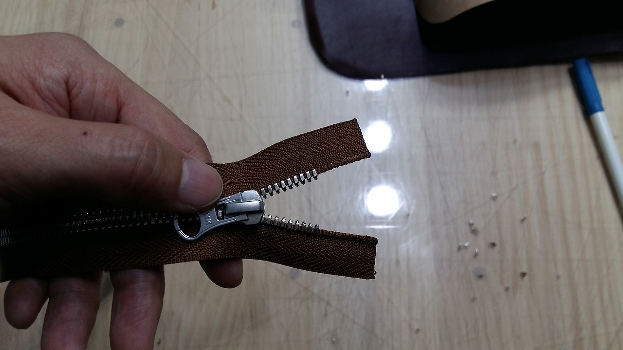 가죽은 브라운색으로, 지퍼 색은 가죽과 비슷한 브라운 계통으로, 지퍼 호수는 비교적 큰 사이즈이기에 5호로, 좀 사무적이고 클래식한 느낌을 주기 위해서 촘촘하고 힘 있는 양쪽 지퍼로, 그리고 그에 맞는 YKK 슬라이드를 사용하겠습니다.