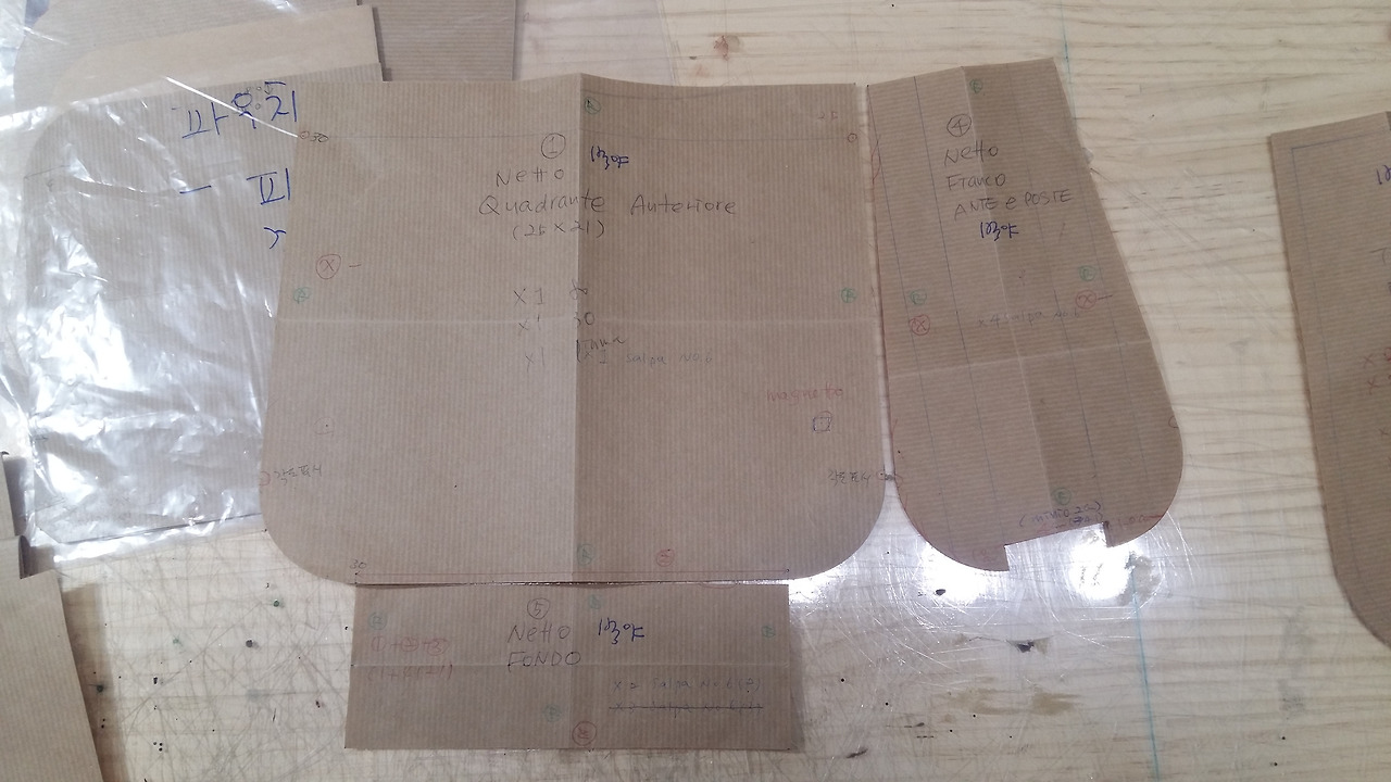 즉, 밑판이 원형이 되어서 전체 가방의 쉐입을 결정하고 이에 맞춰서 윗판,뒷판,옆판들이 결정되는 패턴입니다.