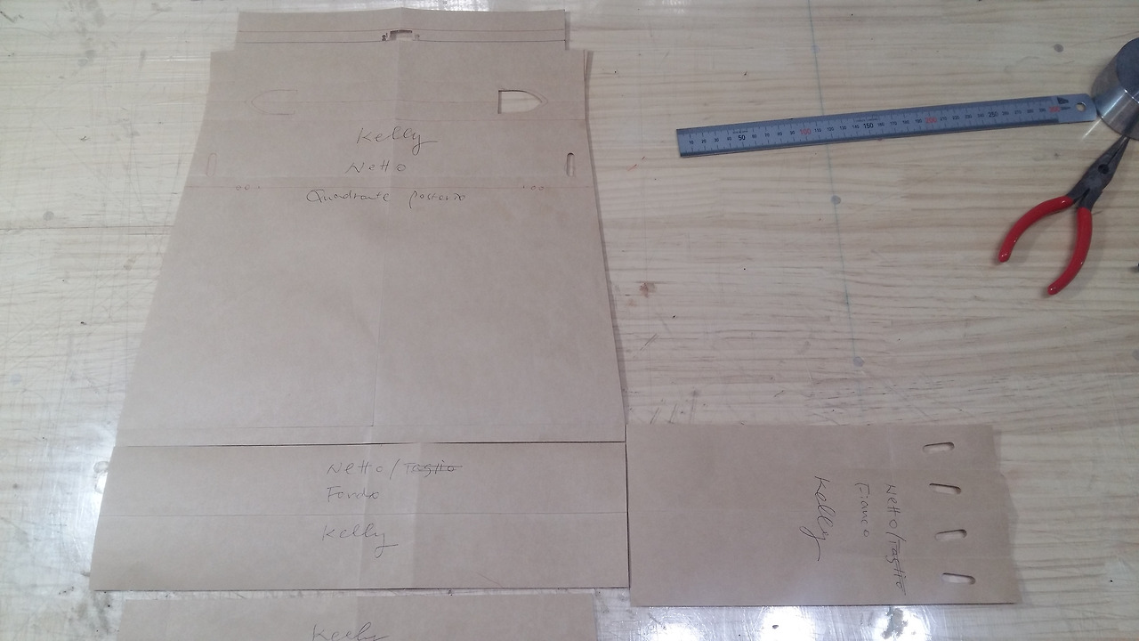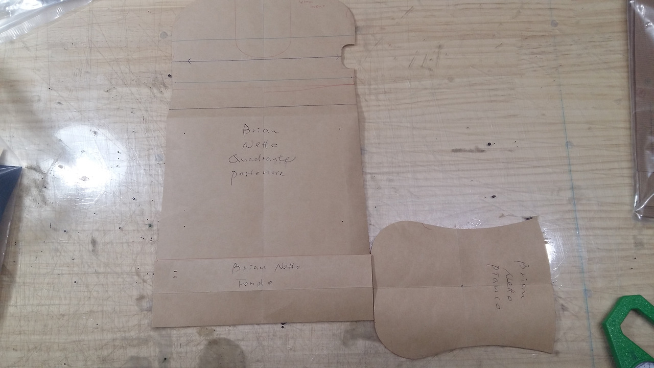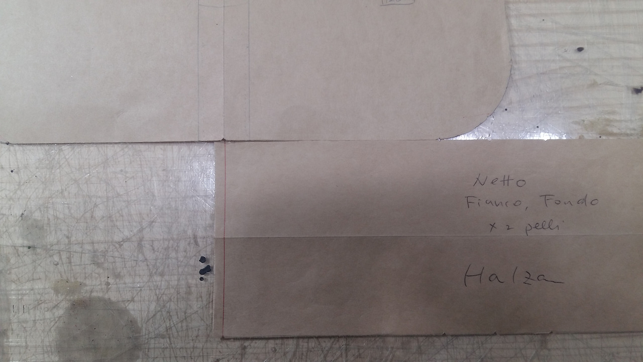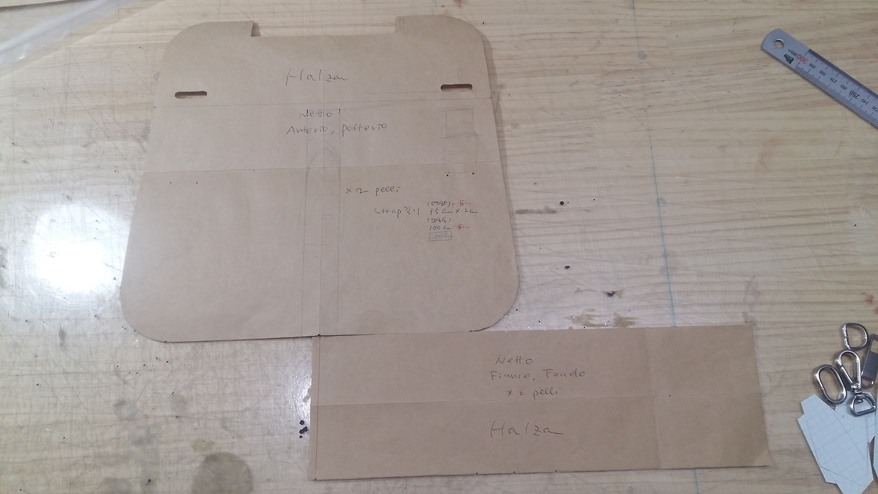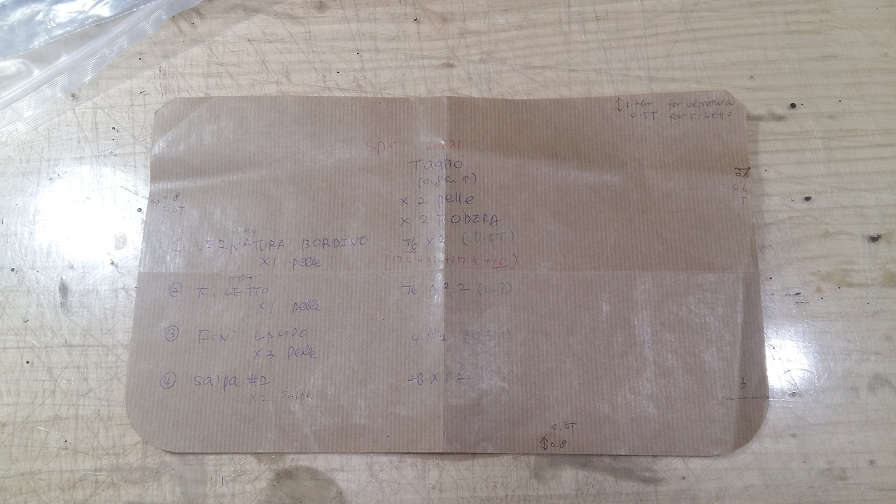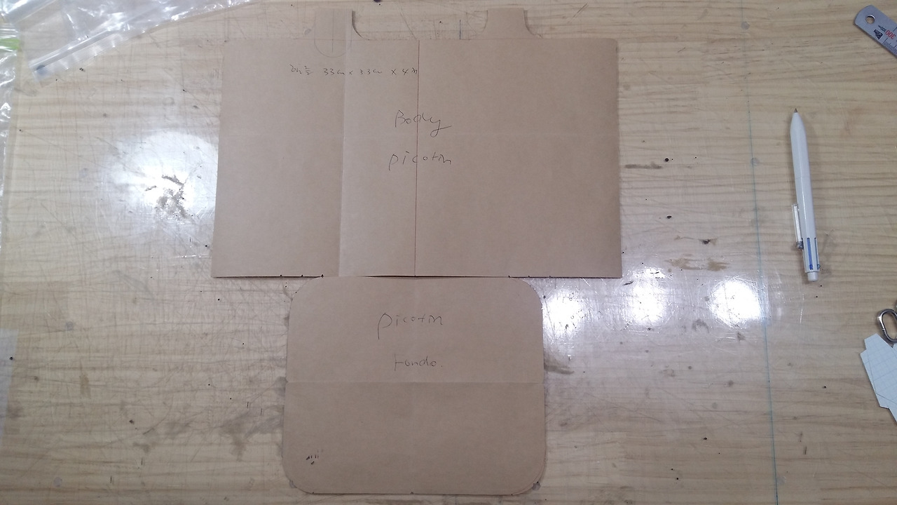 여기서 한 가지, 밑판을 별도로 패턴을 뜨고 앞, 뒤판에 결합할 것인지, 아니면 그냥 통으로 재단을 할지가 있는데요. 가죽 면적이 충분하다면 통으로 패턴을 뜨는 것이 작업 공수를 줄일 수 있지만, 현실적으로는 면적뿐 아니라 쓸만한 면적을 고르거나, 가방의 밑판에 좀 더 힘을 주기 위해서 각각 분리해서 패턴을 뜨고 합봉 하는 것이 좋겠습니다.