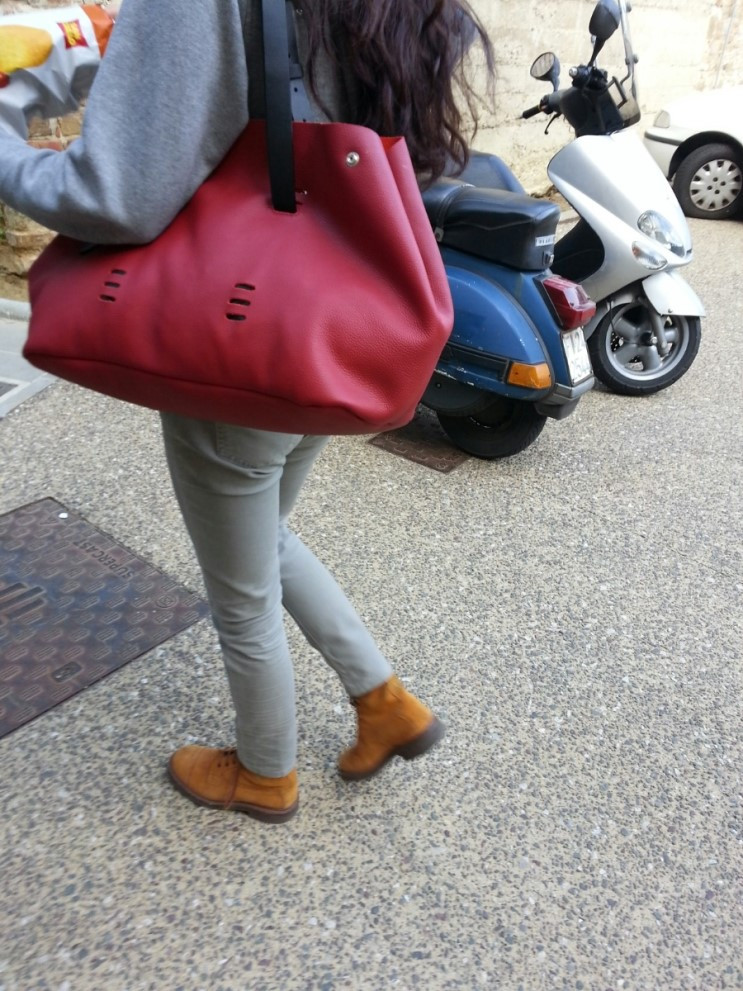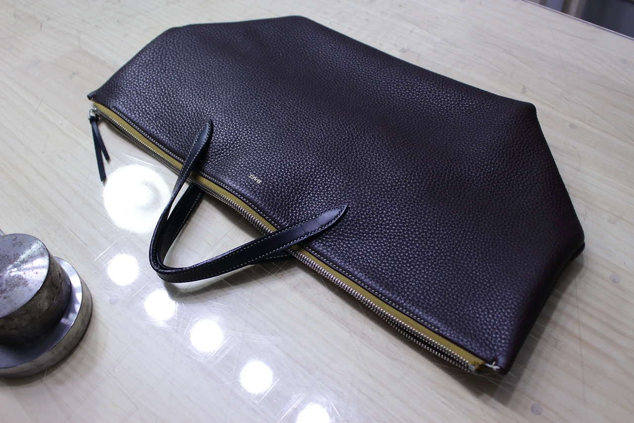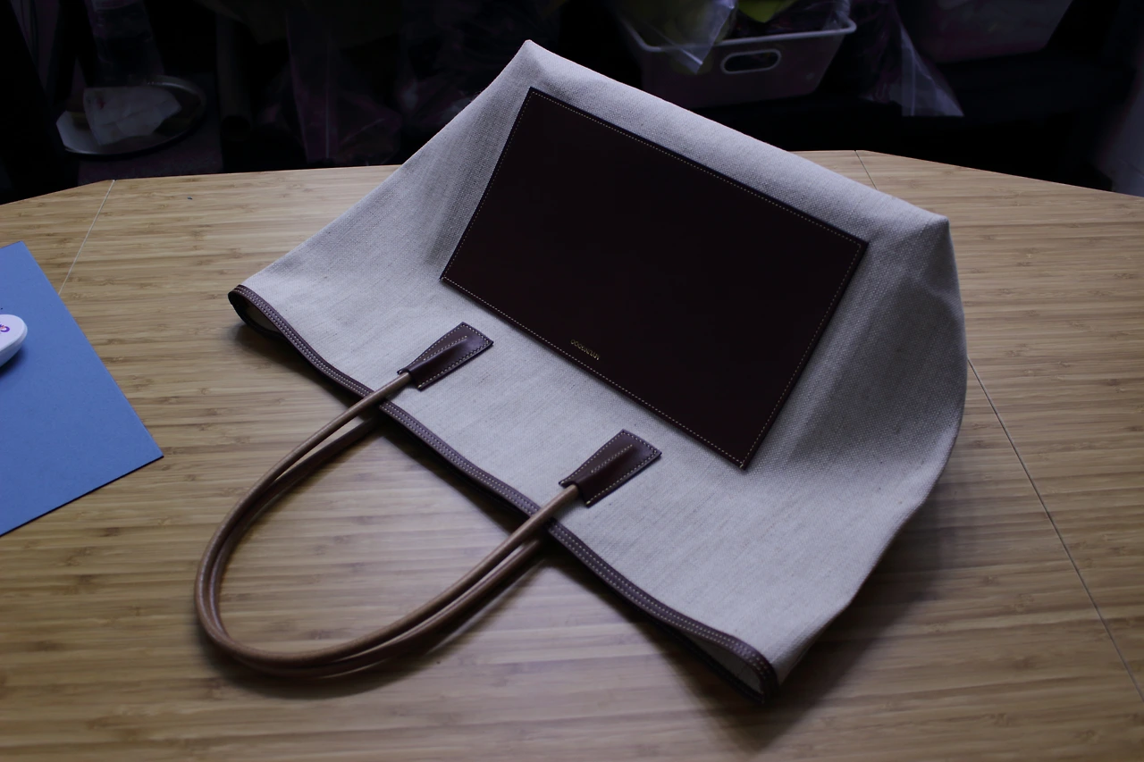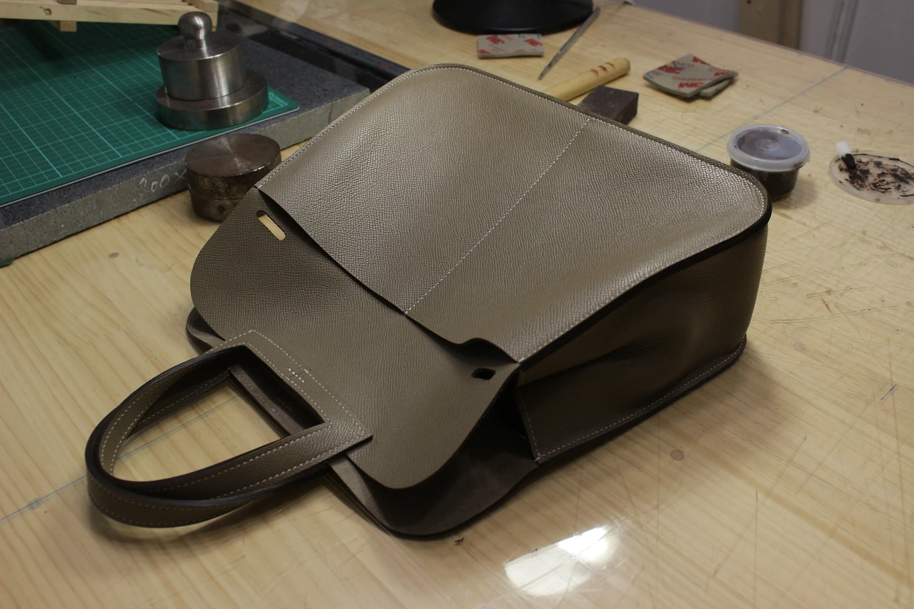 그리고 여기서 좀 더 나아가면 밑판과 옆판의 각도를 조절해서 가방이 위로 갈수록 전체적인 쉐입이 오므라 들거나, 앞판의 모양을 위로 갈 수록 좁게 해서 합봉 된 형태의 앞모습이 덜 넓게 퍼지게 할 수도 있습니다.