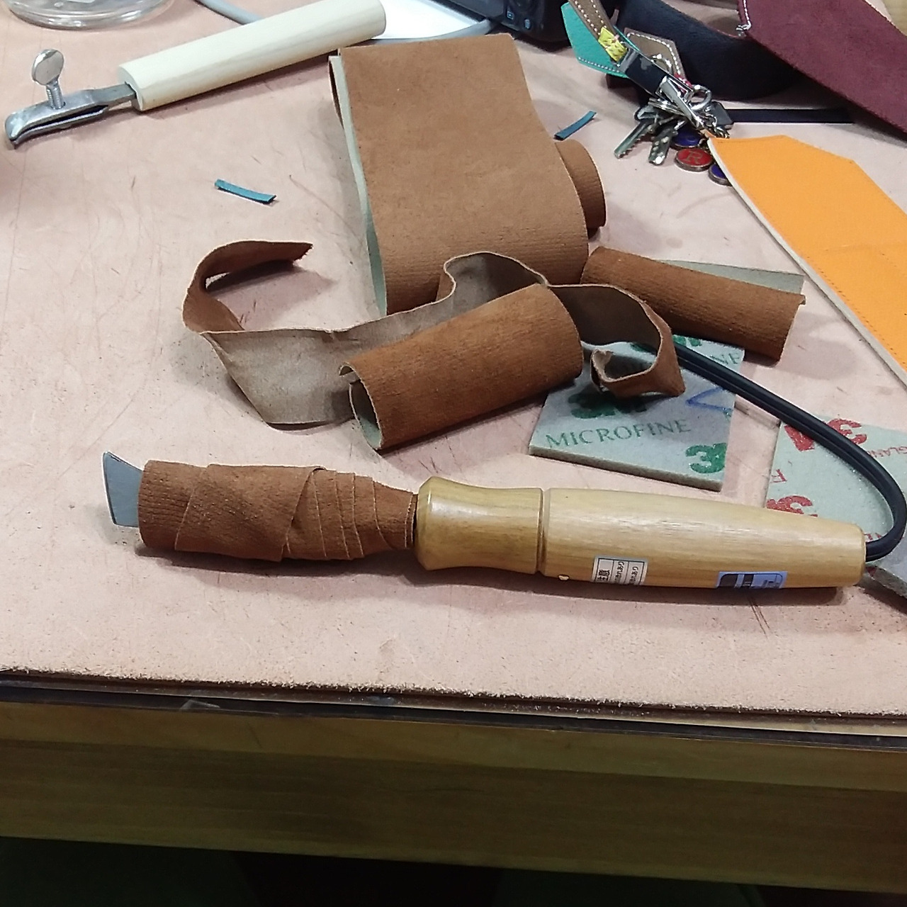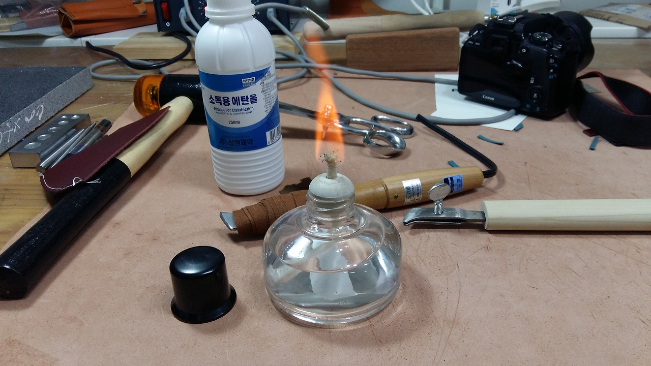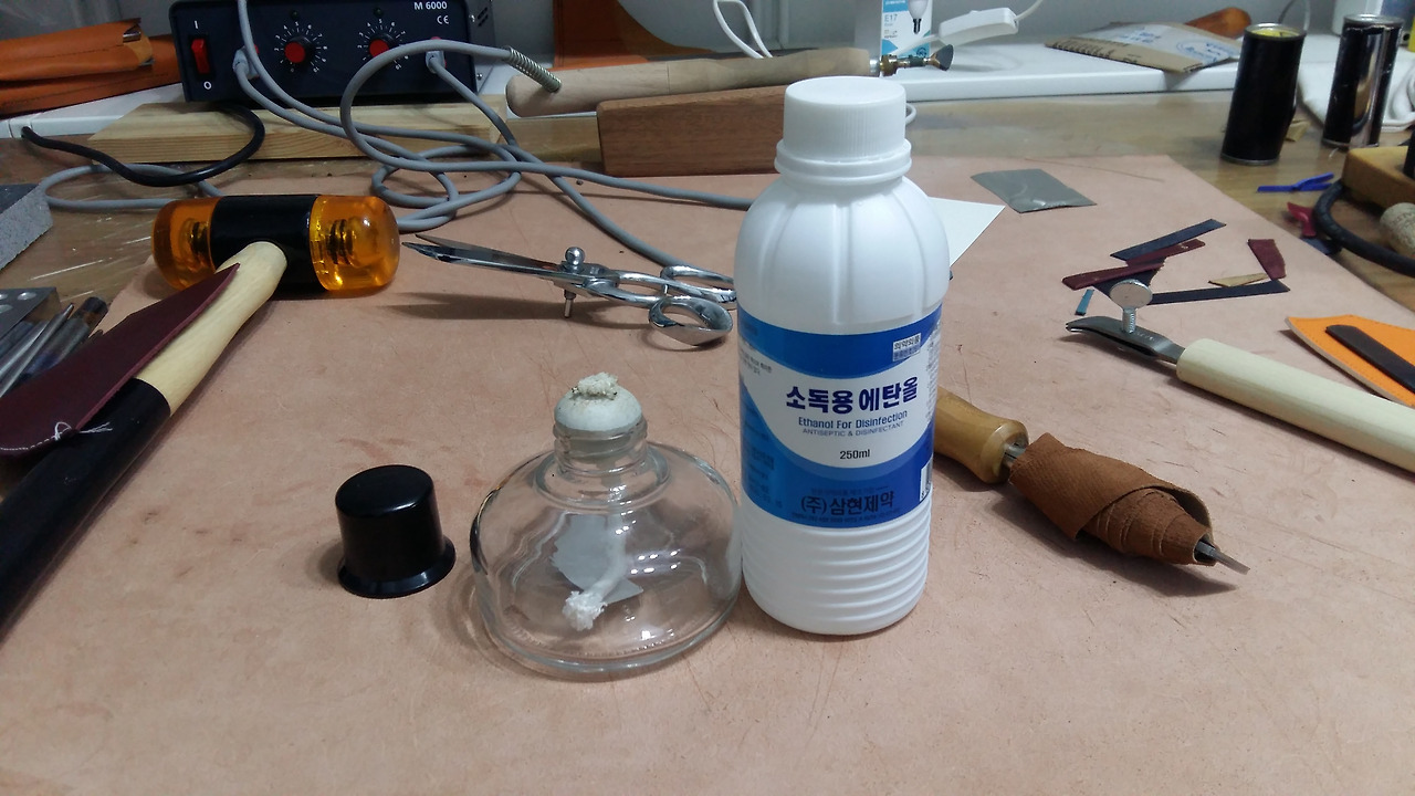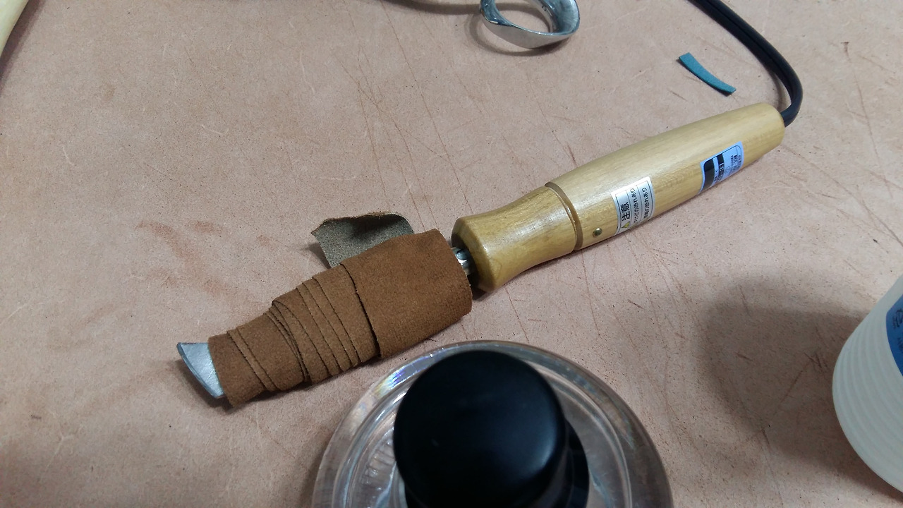 사진의 인두는 일본 아사쿠사에서 구입했던 것을 전기선은 끊고 또 날 부분을 가죽으로 덧대어 봤습니다.