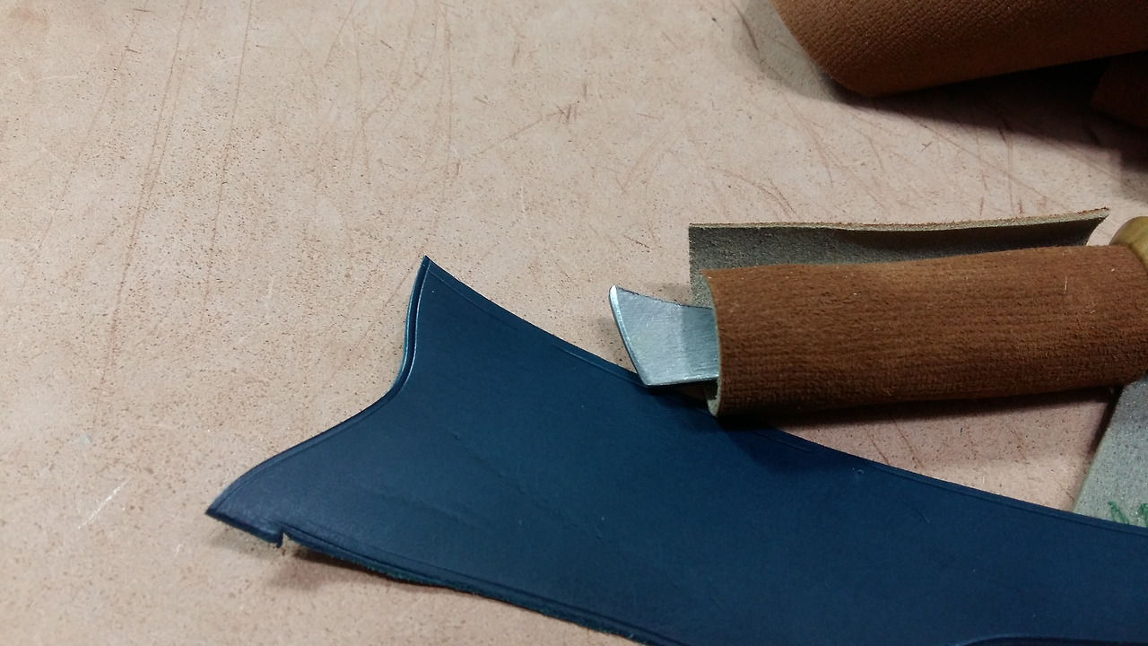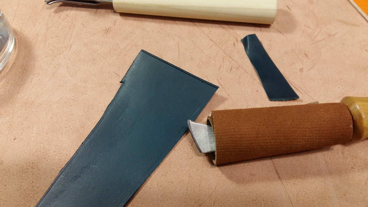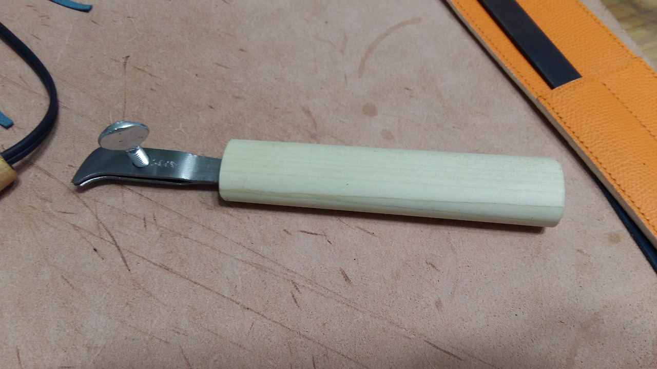 필요시에는 사진처럼 날을 가죽으로 감싸서 조금 더 아래면을 잡을 수 있도록 하면 곡선에서 좀 더 잘 그어지겠습니다.
