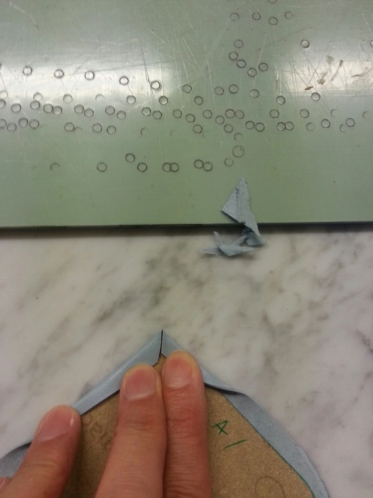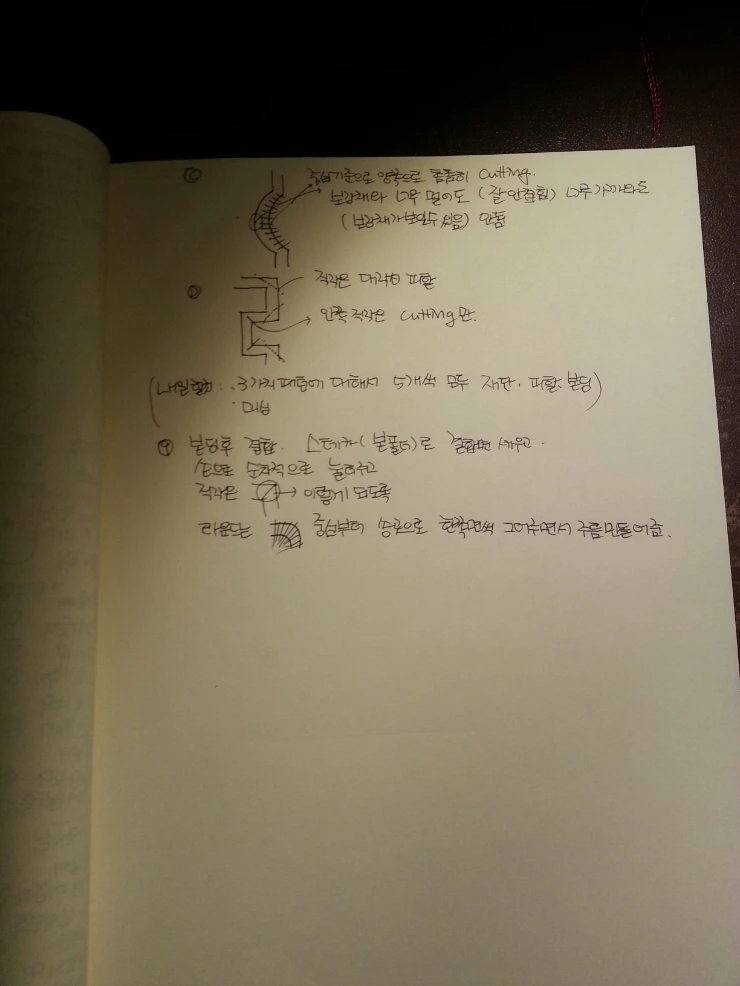 직각 손피할 잘 못 된것(양쪽 접으면 겹침. 이 경우 좀 더 보강재쪽으로 피할해야 함).