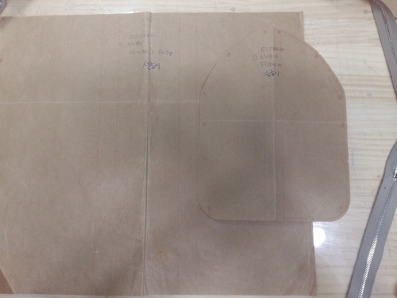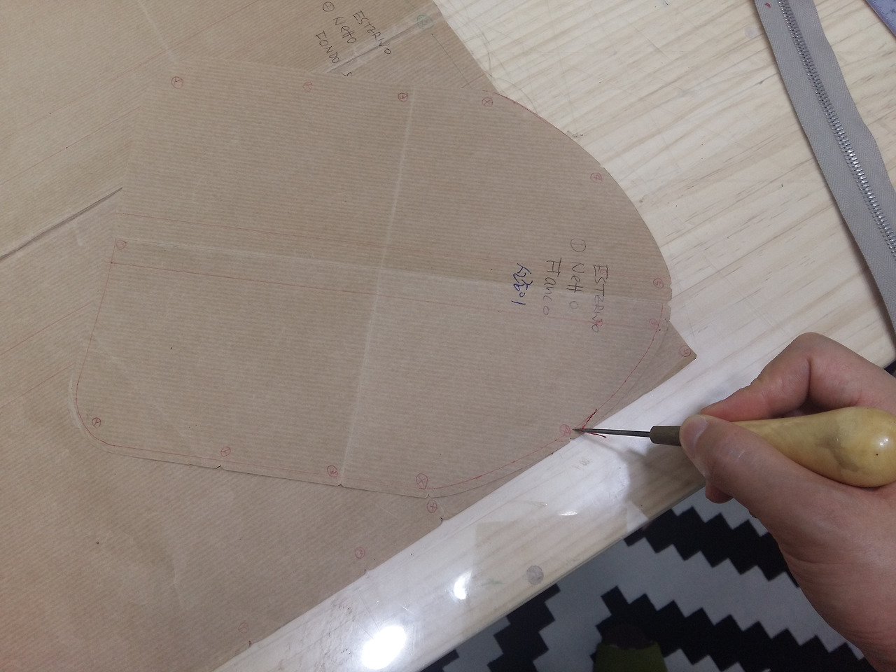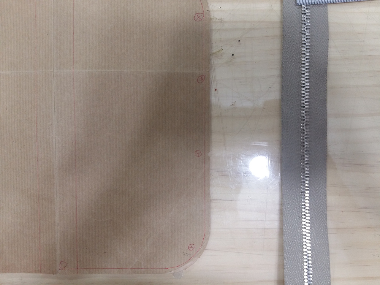 에스테르노(Esterno, 겉) 형지에는 지퍼 5호에 맞게 중심 기준으로 양 쪽 0.8센티씩 브이 홈을 파서 표시해 주세요.