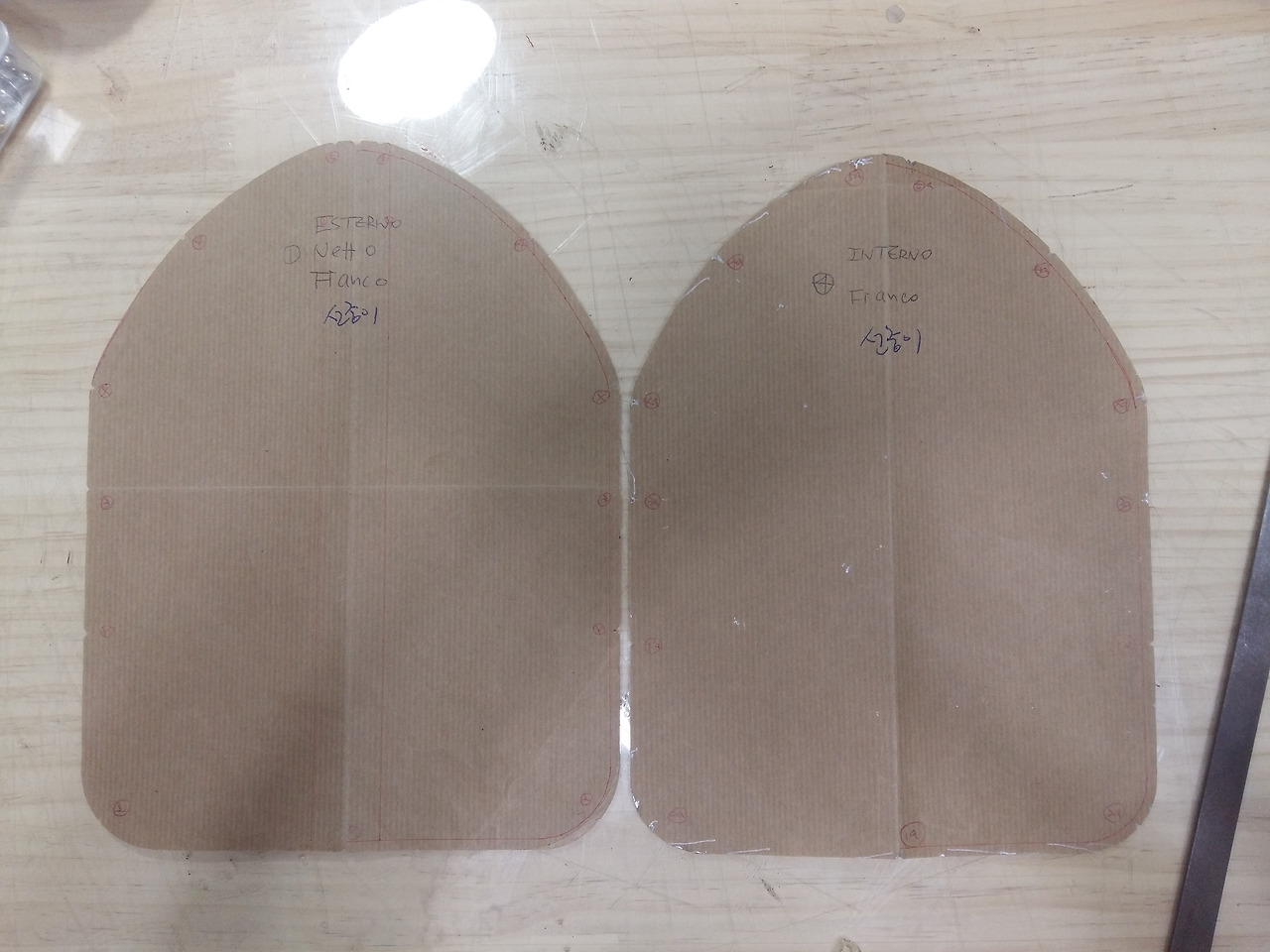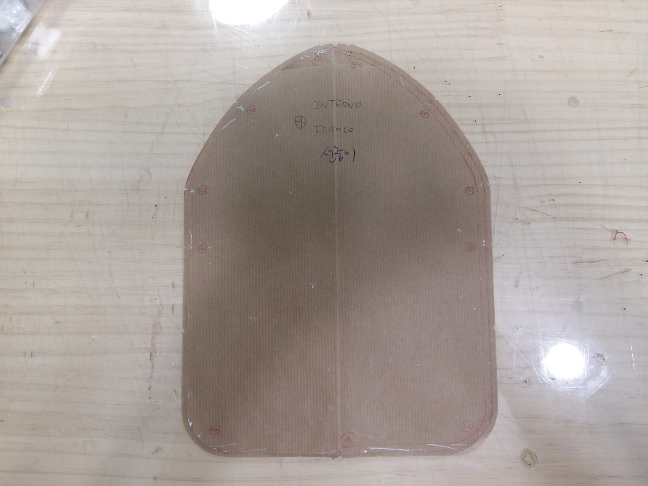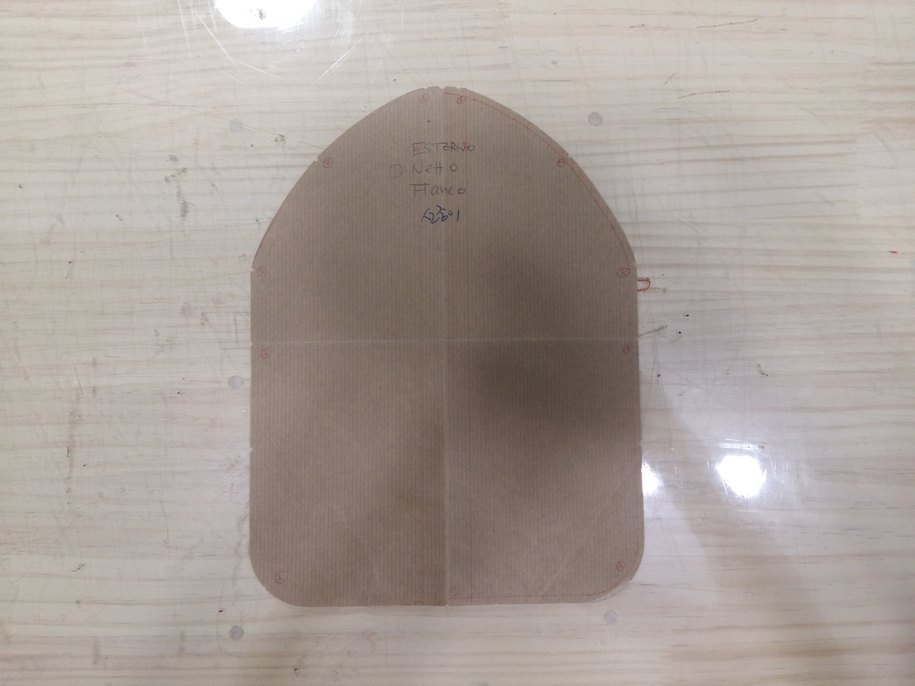 에스테르노(Esterno, 겉) 형지에는 지퍼 5호에 맞게 중심 기준으로 양 쪽 0.8센티씩 브이 홈을 파서 표시해 주세요.