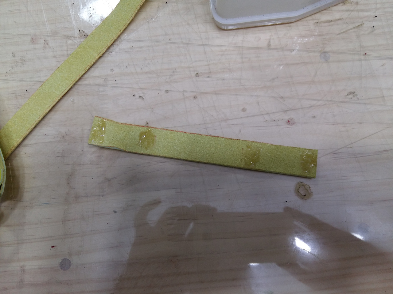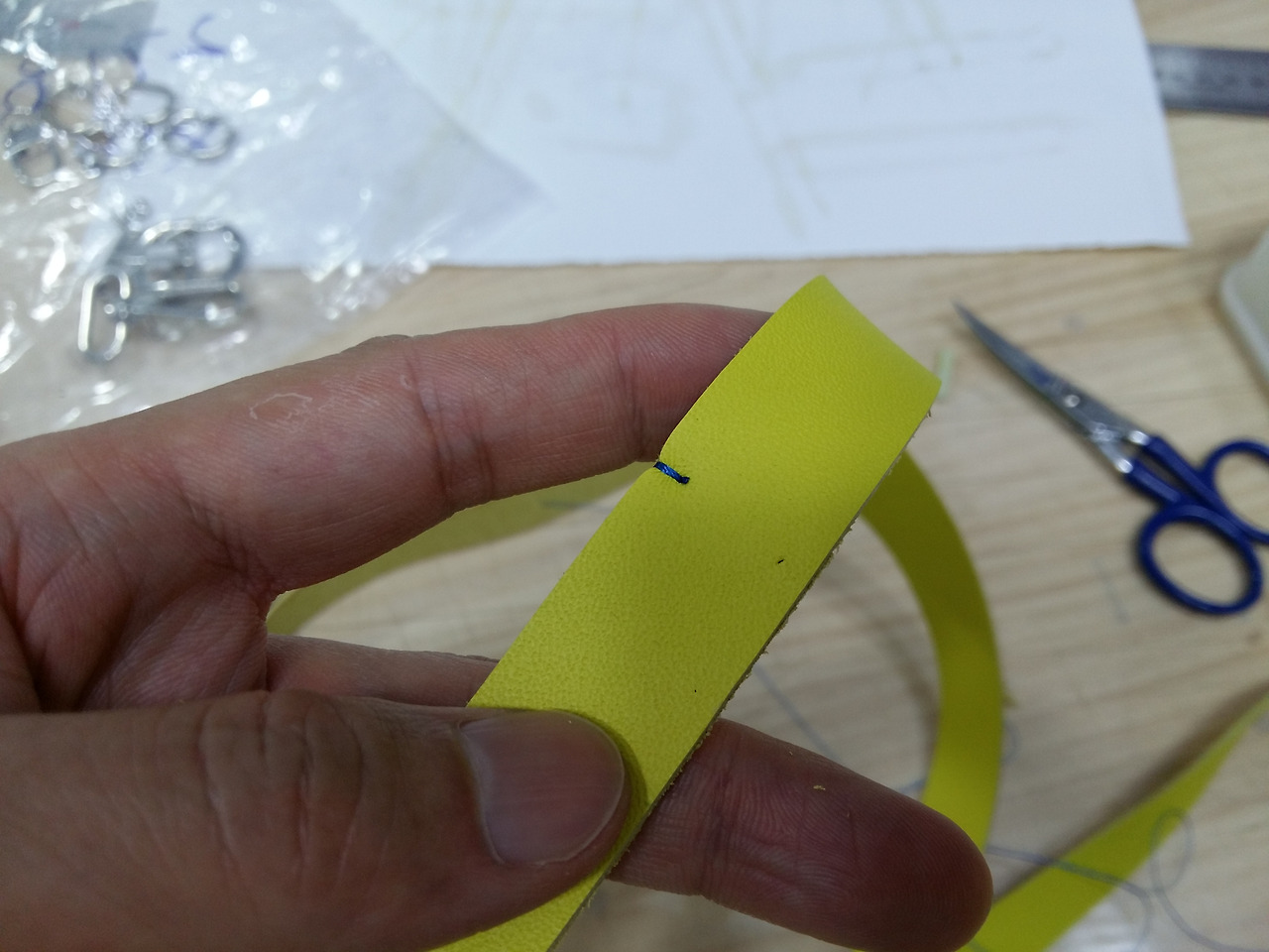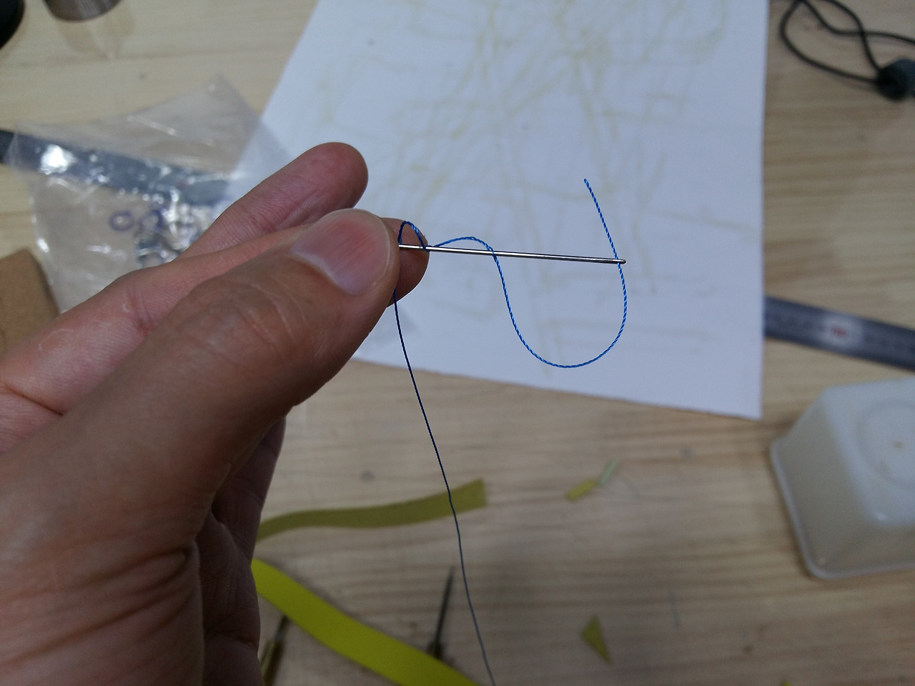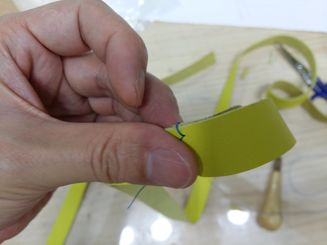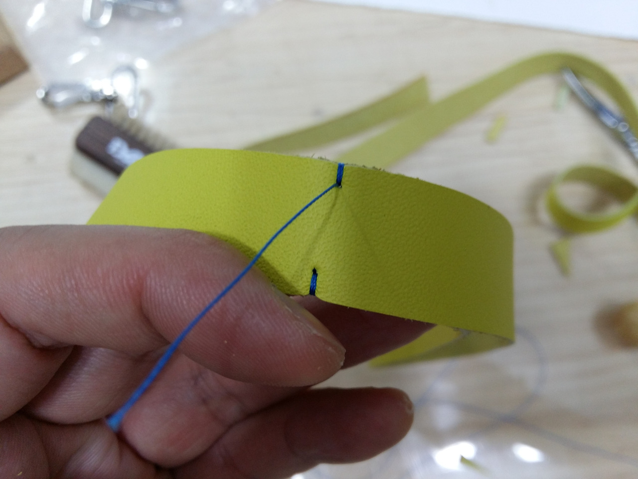 사진처럼, 본딩만 해서는 나중에 뜯어질 수 있으니 바느질을 하되 이번에는 미싱도 쓰지 않고 핸드스티칭을 할 도구도 없다고 생각하고 그냥 송곳으로 구멍을 내어서 실로 두세 번 감겠습니다.