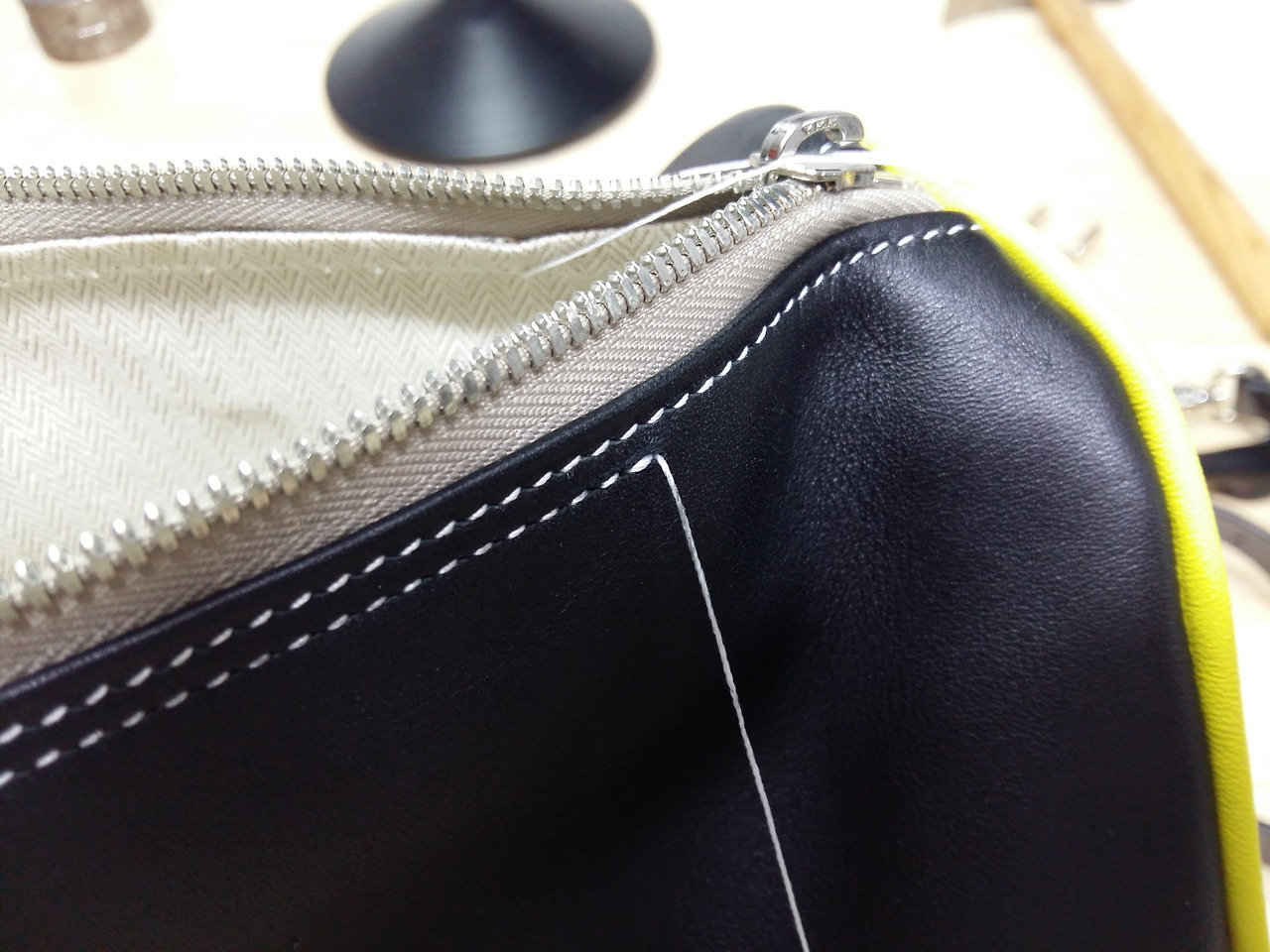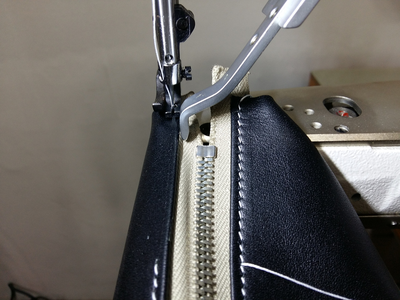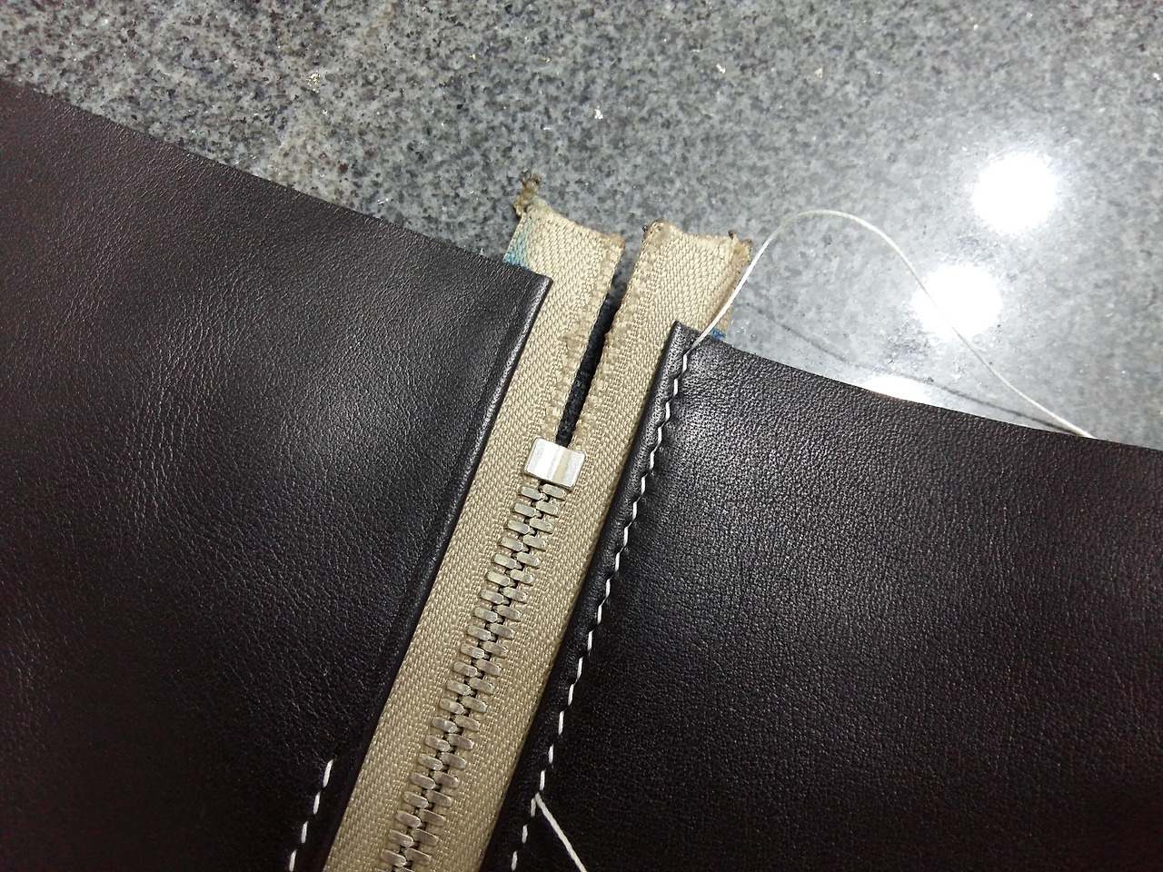 지금 이 가방은 지퍼의 슬라이드가 최대 열린 지점 이후부터만 미싱이 가능한 어려움이 있습니다.