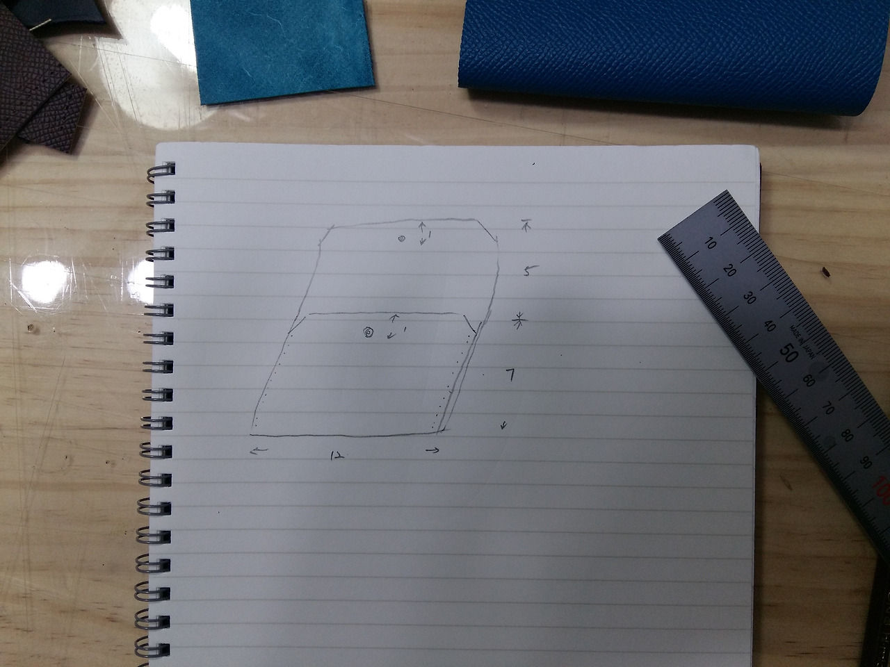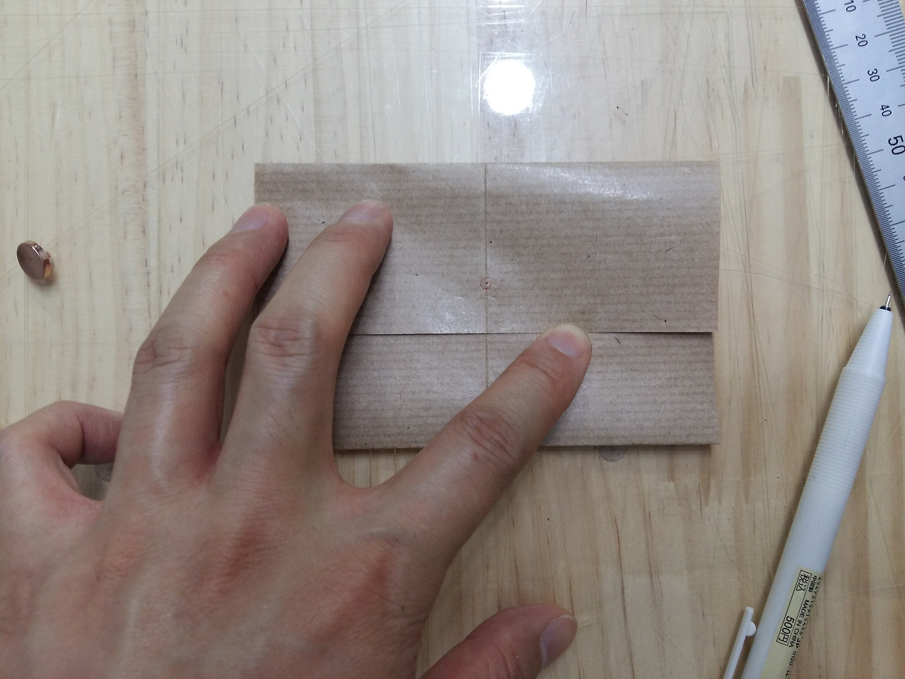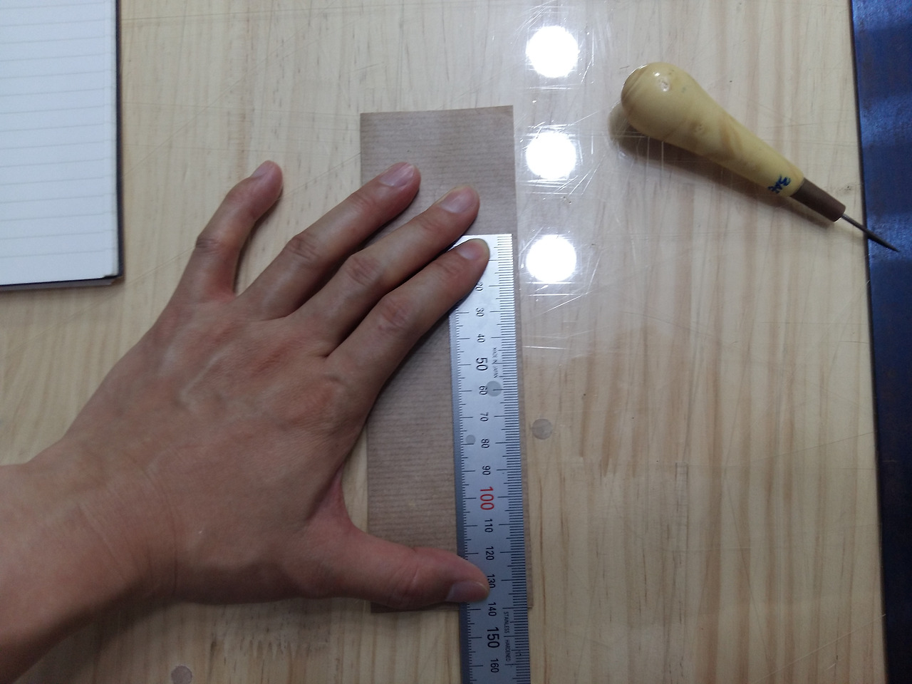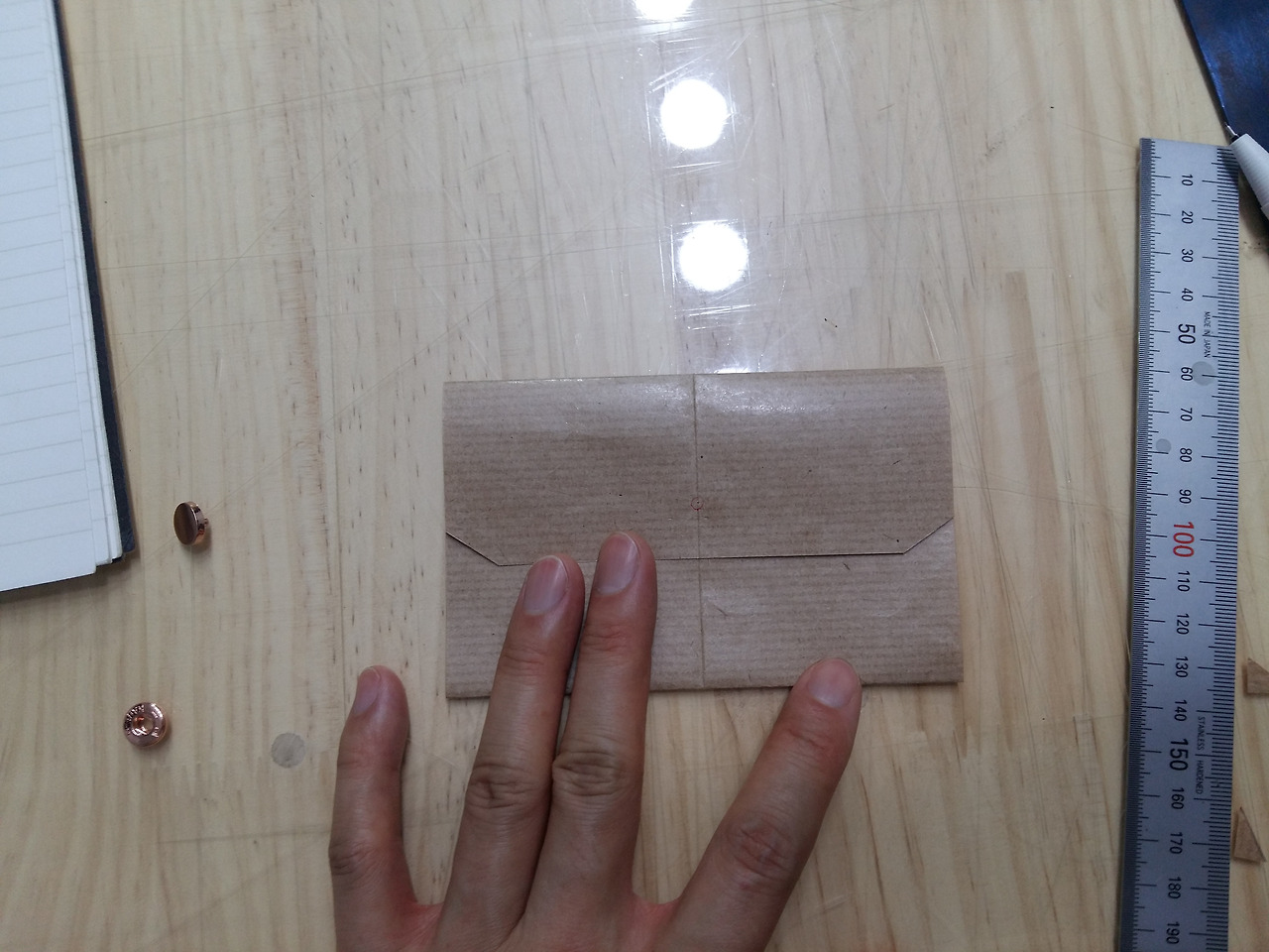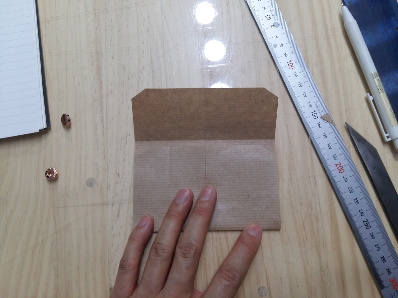 먼저 접혀서 앞판이 뒤판과 결합될 지점입니다. 저는 앞판 세로를 7센티로 정해기에 마킹할 위치는 그 두배인 14센티가 되겠습니다.