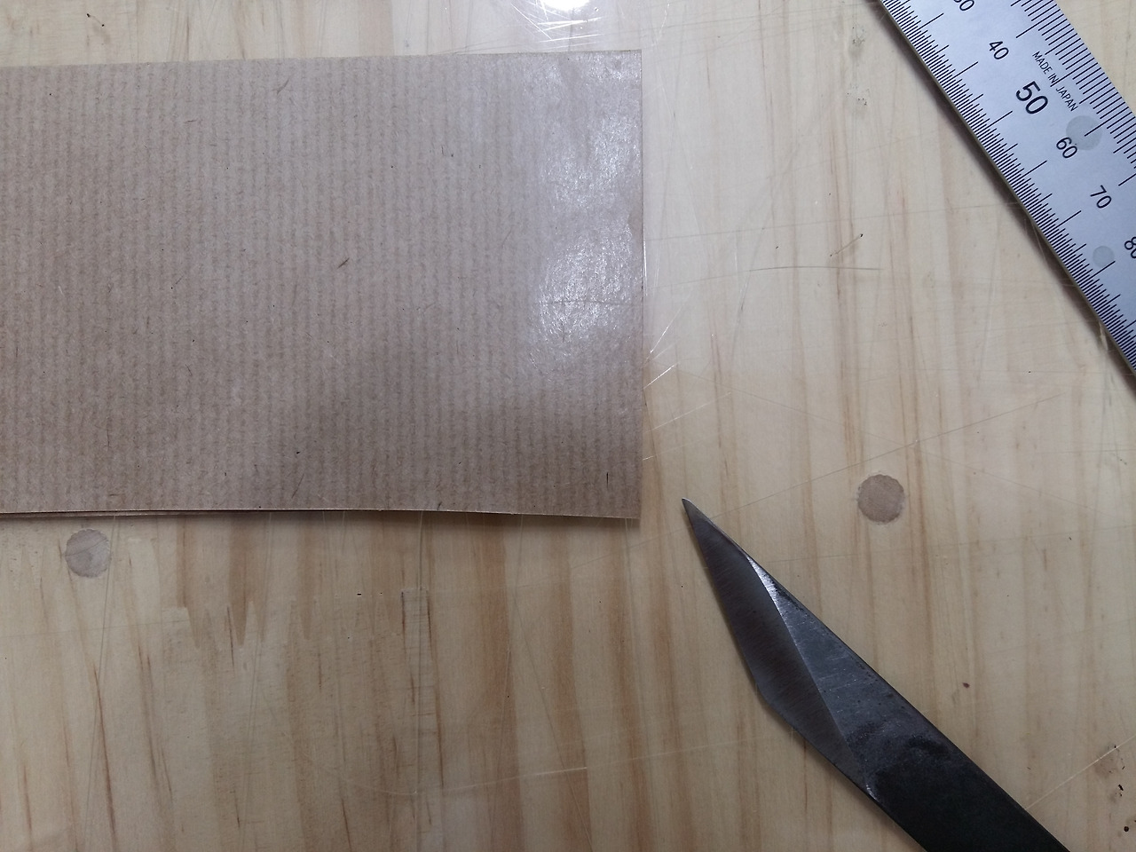 카드지갑 총 폭의 반쪽. 즉, 전체 12센티 중 그 절반인 6센티에 칼집을 내고 펴서 잘라 주세요.