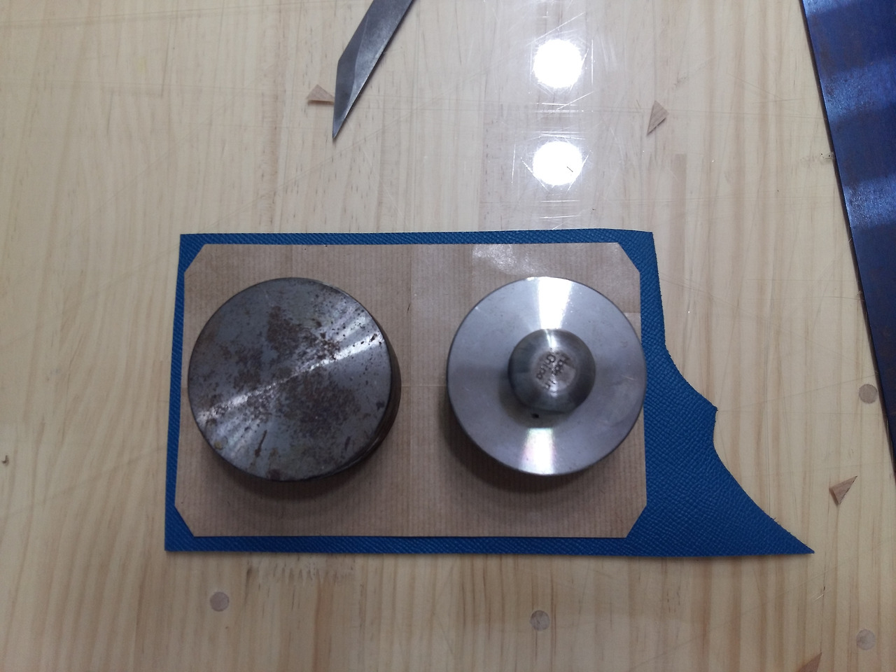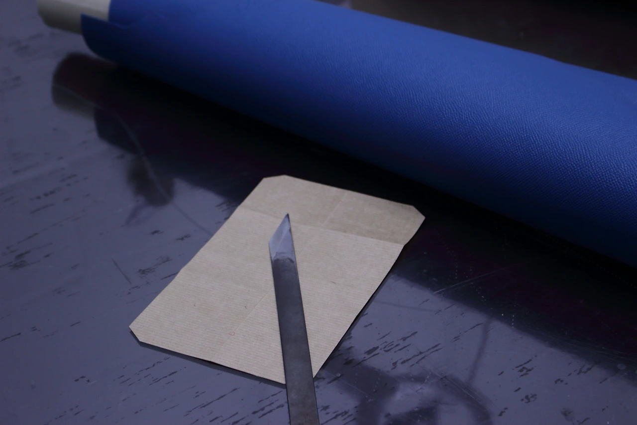 가죽의 흠이 없다는 확인 하에 뒤집어서 상대적으로 표시가 잘 되는 면에 형지를 대고 잘라 주셔도 됩니다.
