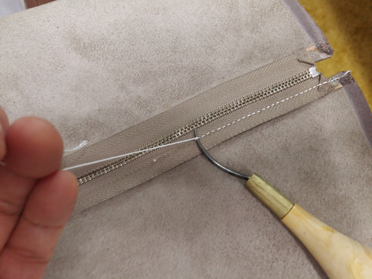 실제로 가죽학교의 마오쌤 경우에는 7년 전의 가방의 실이 풀어진 것도 그 구멍으로 땀을 맞춰서 스티칭을 하시는 신공(?)을 보여 주시기도 했습니다.