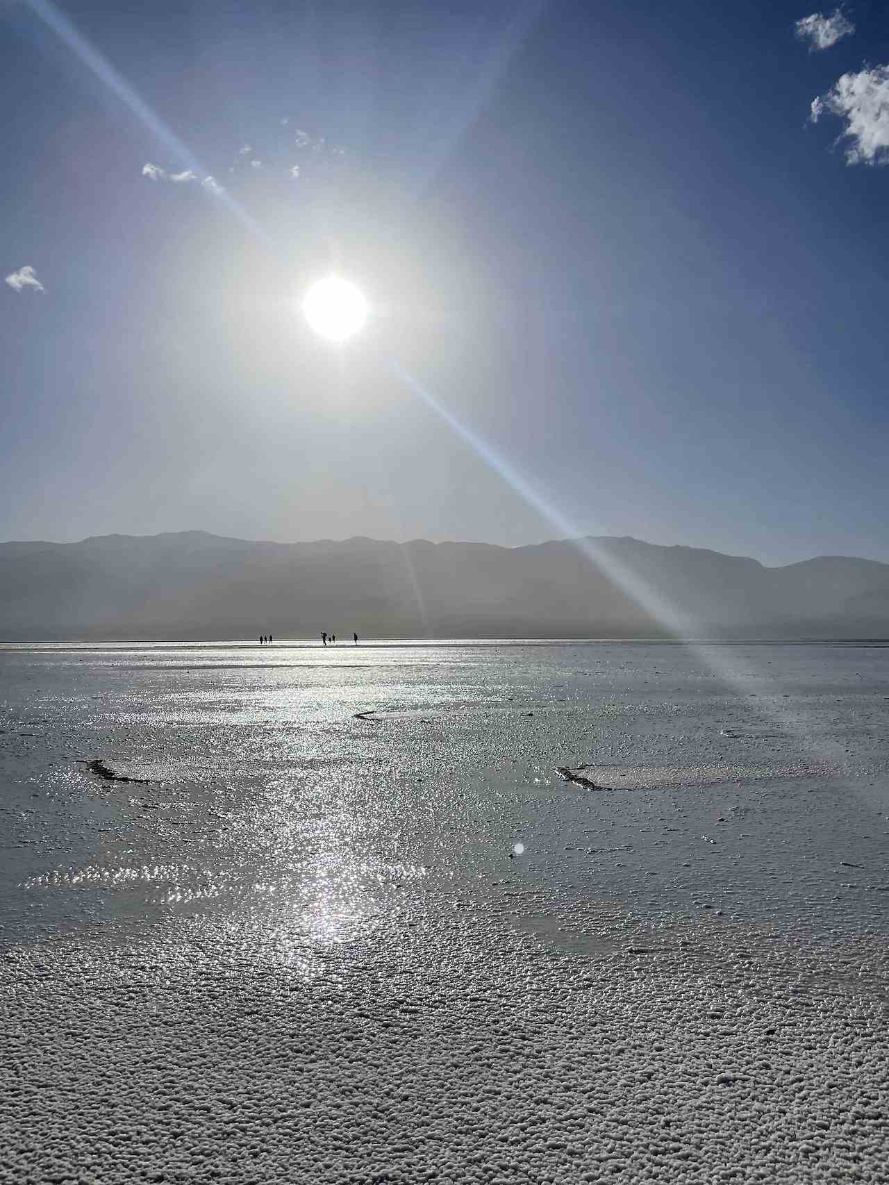 그다음 목적지는 배드워터 베이신(Badwater Basin)이었다. 배드워터 베이신은 북미 대륙에서 가장 낮은 지점으로, 해수면 아래 약 85.5미터(282피트)에 위치해 있다. 하얀 소금 평원으로 덮여 있어, 독특한 지형과 경관을 감상할 수 있는 이곳은 마치 다른 행성에 있는 듯한 기분을 느끼게 한다. 소금 사막을 보고 싶다는 꿈을 안고 도착했지만, 도착하자마자 몸을 가누기 힘들 정도로 강한 바람이 불기 시작했다. 너무 건조한 시기였기 때문에 물이 없어 기대했던 거울 같은 반사 효과를 보지는 못했지만, 모든 것이 신기하게 느껴졌기 때문에 바람을 이겨내며 그저 재밌고 흥미로운 경험이라 생각하며 즐겼다.