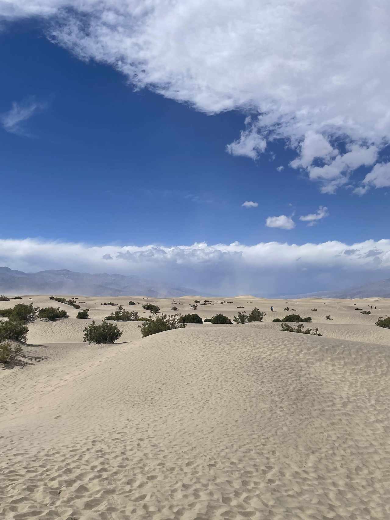 집을 떠난 후 처음으로 차의 엔진을 멈춘 곳은 메스키트 플랫 듄(Mesquite Flat Dunes)이었다. 이곳은 데스 밸리의 중심부에 위치한 부드러운 모래 언덕으로 이루어진 지역이다. 또한 영화 "스타워즈"의 촬영지로도 유명하기도 하다. 이전에 사막을 한 번도 본 적이 없어서, 듄의 존재에 큰 기대를 하고 도착했는데, 생각보다 작은 규모의 사막 언덕이었지만, 주변 데스 밸리의 장엄한 풍경과 어우러져 감탄이 절로 나왔다. 영화 "듄"에서 본 샤이 훌루드를 피해 걷는 법도 따라 해 보았다. 이곳은 특히 일출과 일몰 시간에 방문하면, 정말 아름답다고 한다.