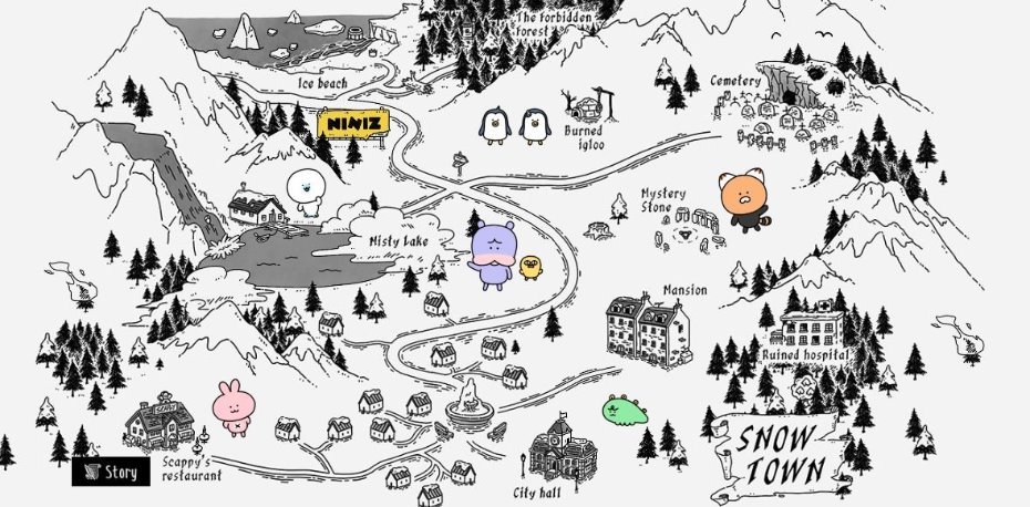 1. ‘스노우 타운’의 니니즈- 살얼음판의 세계관 니니즈는 동물을 모티브로 한 8마리의 캐릭터들이 등장하고, 이들은 각자의 사연을 지닌 채 미지의 공간 ‘스노우 타운’에 살아 가고 있다. 홈페이지에 공개된 마을의 지도는 마치 ‘반지의 제왕’ 의 배경을 연상시킨다. 빙하가 떠다니는 얼음 바다 아이스 비치, 안개가 낀 침울한 미스티 레이크, 침엽수가 빽빽히 자라는 살얼음판의 창백한 북유럽 숲 사이에는 공동묘지와 타버린 이글루, 파괴된 병원이 있다. ‘빙하와 눈으로 뒤덮인 미지의 스노우 타운, 그곳에서 살고 있는 너무나 귀엽고 무해해 보이는 녀석들, 과연 정말로 무해한 녀석들일까?’ 라고 소개하고 있는 니니즈는 살벌한, 귀여운 동물 얼굴 뒤로 숨은 복수의 사연을 안은 살얼음판의 세계관을 예고한다. 기존 카카오프렌즈가 유머와 우리의 일상과 밀접한 컨셉으로 캐릭터들이 콘셉트가 기획되었다면, 니니즈만큼은 미스터리한 판타지의 세계관으로 볼 수 있다. 지배적인 분위기는 생선 뼈, 해골, 무덤에서 풍기는 것처럼 죽음이 연상된다.