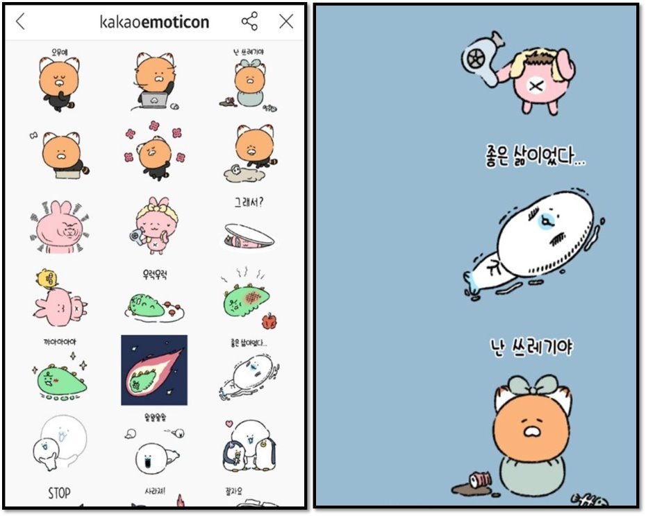 초기의 이모티콘 디자인은 활자라는 언어의 특성을 아주 충실히 대변하는 로고의 기능이 강했다. 인사나 짜증과 졸림 과 같은 단순한 감정표현, 돈이나 술과 같은 사물을 버튼 누름 하나로 의사소통 하기 수월하고 재미의 기능이었다. 카카오 프렌즈는 말로 표현하기 힘든 미묘한 상황과 감정을 위트있게 디자인하였고, 니니즈는 캐릭터와 스토리 자체를 소비하도록 기획된 듯 보인다.