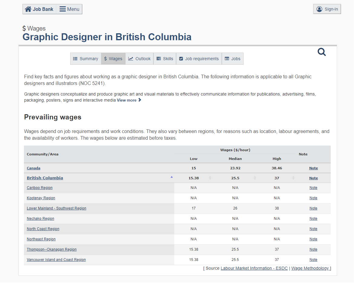LMIA를 진행할 때는 꼭 받아야만 하는 임금이라는 의미의 "기준 시급"이 제일 중요하다. Median Wage (미디언 웨이지)라고 하는데, 직업군이 받는 최소 임금과 최대 임금의 중간값이라고 생각하면 쉬울터. Job Bank라는 캐나다 정부 사이트로 가서 궁금한 직업을 서치 해보면 그 직업을 수행하기 위한 조건과 역할, 자격증 필요 유무의 정보뿐만 아니라, 캐나다 각 주에서 그 직업으로 일을 하는 사람이 받는 최소 금액과 최대 금액 그리고 그 중간값을 산출해 놓았다. (이는 매년 한두 번씩 업데이트가 된다. 예.고.없.이) 아래는 어딜 가도 취업하기 좋은 직업이라고 생각되는 Graphic Designer의 Job Bank Wage Report의 스크린 샷이다.