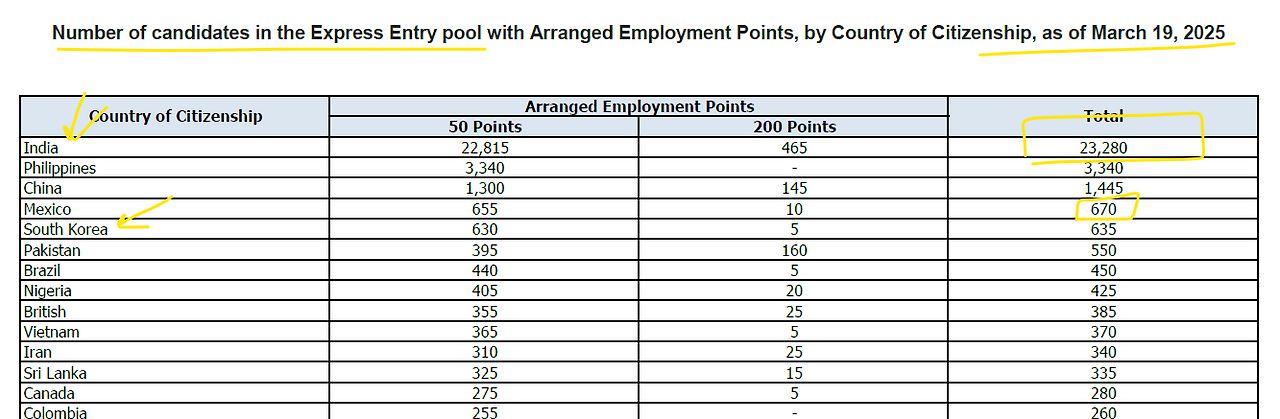 우리가 그동안 상식처럼 여겨왔던 ‘잡오퍼 = 영주권 가까운 길’이라는 프레임은 생각보다 견고하지 않았다는 이야기다. 많은 지원자들이 애초에 잡오퍼 없이 경쟁을 해왔고, 점점 더 시스템도 그쪽으로 무게를 실어가려 한다는 이야기가 아닐까? 그리고 여기서 하나 더 잡오퍼 점수를 가진 사람들의 출신국을 보면 불균형은 더 분명해진다... 놀라지 말자.