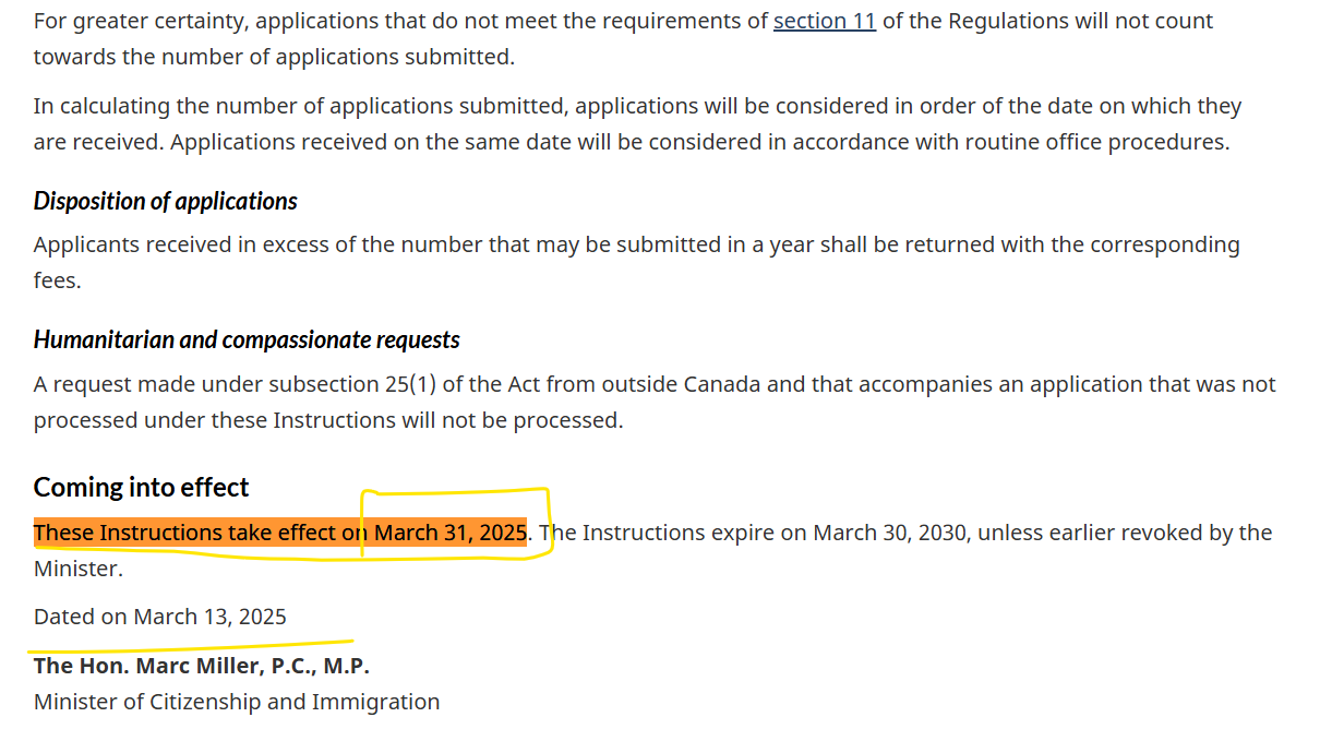 그럼 이건 확정된 정책인가? 많은 분들이 “매번 알렉스가 말하는 데로 아직 관보 Part 1에 올라온 거니까 이건 프로포절일뿐 바뀔 수도 있는 거 아닌가요?”라고 묻지만, 이번 건은 다르다. 이민법(Immigration and Refugee Protection Act)상 장관이 발행하는 Ministerial Instructions는 Canada Gazette Part 1에만 실려도 바로 효력이 생긴다. 이번에도 지침서 안에 명확히 명시돼 있다. “이 지침은 2025년 3월 31일부터 시행된다.” 더 기다릴 것도 없이, 발표된 대로 3월 말부터 이 기준대로 접수가 시작됐다.