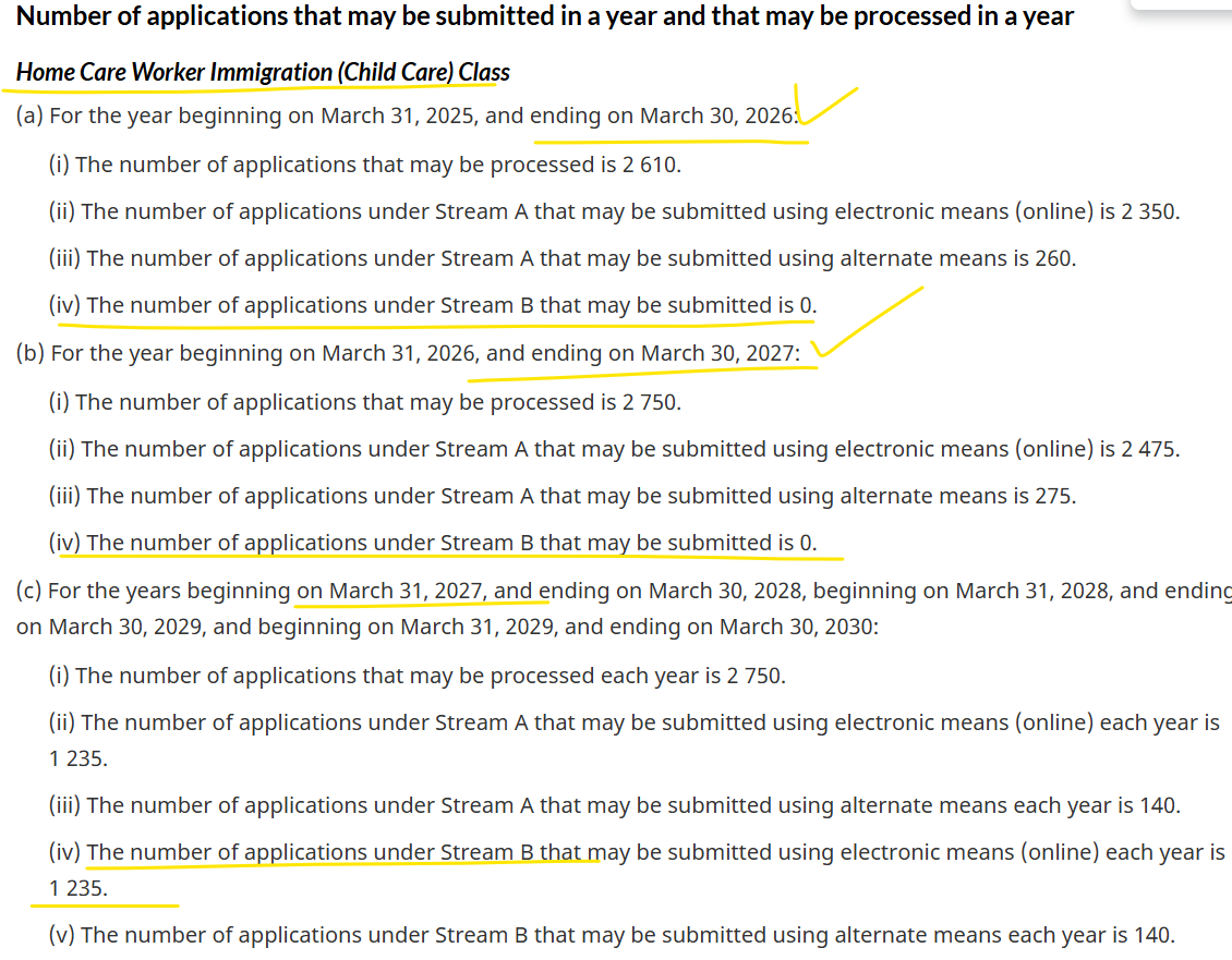 2025년 3월 22일자 Canada Gazette Part 1에 케어기버 이민 프로그램(Child Care / Home Support)에 대한 새 지침이 올라왔었다. 3월 31일부터 시작이라고 딱 박혀있었는데 왜 그 전에 보지 못했을까? 왜 선착순 전쟁이었던 3월 31일 전에 이미 이슈가 되지 않았을까? 해외 지원자들 또는 캐나다에서 현재 일을 하고 있지 않는 사람이 신청할 수 있는 스트림 B에 대한 중요한 메세지던데. 엄청 많은 사람들이 기다리고 있었을 건데. 신기하다. 지금이라도 읽어본 게 어디냐만은. 내용의 포인트는 즉, 매년 정해진 수만큼만 신청을 받고 처리하겠다는 기존 방식은 유지하되, 세부 구성이 처음의 예상과 달리 많이 바뀌었다. 파일럿이 공개된 그때부터 많은 사람들의 관심은 “이번엔 Stream A, B가 어떻게 나뉘나”였고, 특히 해외에서 지원하려는 경우 Stream B 접수가 언제부터 가능한지에 쏠렸었다. 그런데 이번 3월 22일자 관보에 명확하게 나와 있더니..... 2025년 3월 31일부터 2027년 3월 30일까지 2년 동안 Stream B는 아예 신청 자체가 불가능하다고 적혀있다. 온라인이든 오프라인이든, 접수를 받지 않는다.