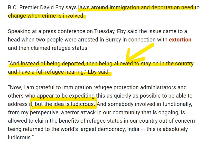 이제 정치권도 움직입니다. BC주 수상 Eby가 "이민/추방법 바꿔야 한다"고 열변 토했어요. 써리 시장도 "범죄자가 난민 지위로 세금 혜택 받는 건 absurd(터무니없다)"고 비판하고 있고요. 국경 닫기, 심사 쿼터 올리기, 프로세싱 간소화로 결과 빨리 내려 추방하기 등의 시도에도 불구하고, 재판 전 범죄자 난민 신청은 정말... 어이 없어 헛웃음만 나옵니다. 난민 신청을 하는 순간부터 deportation delayed forever가 되는 현실인가죠. IRB가 빨리 처리하려 애쓰긴 하지만, 백로그가 산더미라서 이거 원......