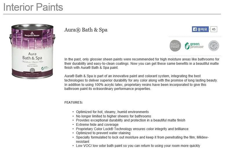 욕실 페인트 중 가장 유명한 것이 벤자민 무어의 Aura Bath&Spa다. 우리집 욕실 벽도 이 페인트를 칠했고, DIY(셀프시공)로 진행했다.