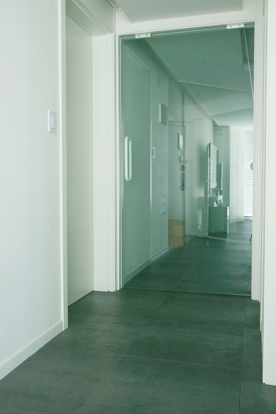 중문은 자연빛이 투과되는 투명한 느낌을 더욱 살려주기 위해 프레임 없이 말 그대로 '통유리'로 제작했다. 이 통유리 중문 덕분에 중문을 닫아놓았을 때도 낮 시간의 현관 공간은 자연빛으로 환하다.