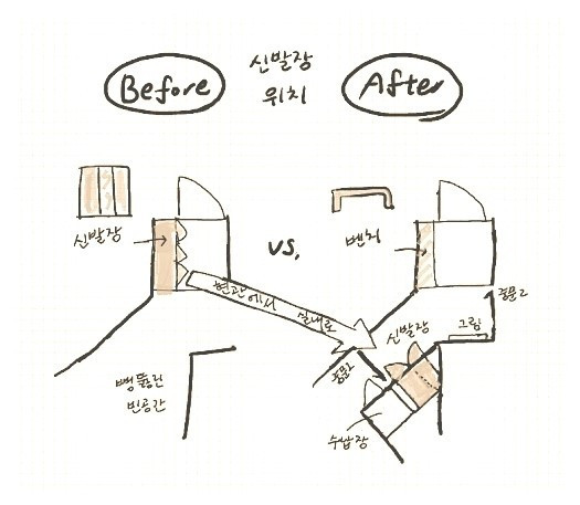 첫째, 현관 공간을 좁게 만드는 신발장을 현관 공간에서 없애고 다른 위치에 새 신발장을 만들었다.