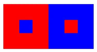 평면 두 개가 있다. 가만히 들여다보면 왼쪽 그림은 파란색이 수축되면서 뒤로 후퇴하는 것처럼 느껴지고, 오른쪽 그림은 빨간색이 앞으로 팽창되며 튀어나오는 것처럼 느껴진다. 평면에 색을 칠했을 뿐인데 입체감이 형성된다(2D->3D).