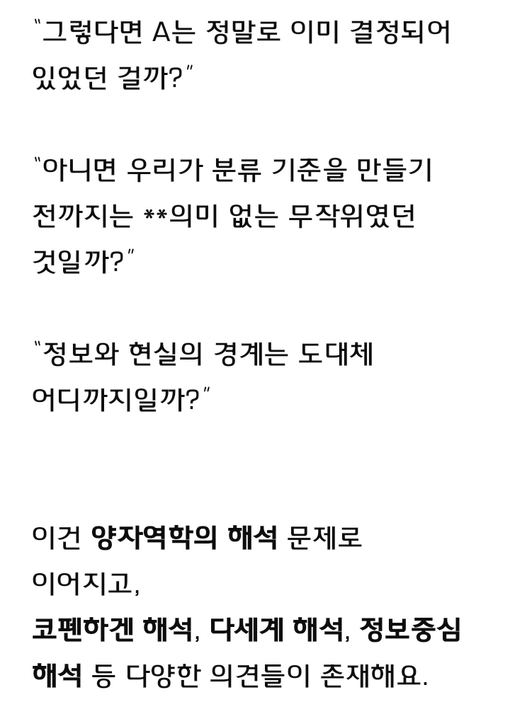 이중 슬릿 시험이 시사하는 바는 크다. 모든 물질은 현상은 확정되지 않은 상태로 있다가 관측자=보는 사람에 의해서 결정된다는 것이다. 이 실험의 철학적인 함의는 다음과 같다. 보는 사람마다- 관측자마다 물질의 상태가 다른 이유는 물질이 본래 다채로운 모양을 가지고 있기 때문이고, 그 결괏값이 각각 다른 이유도 거짓이거나 꾸밈이 없다. 챗지피티도 아래와 같이 철학적인 물음을 던진다 놀랍게도.