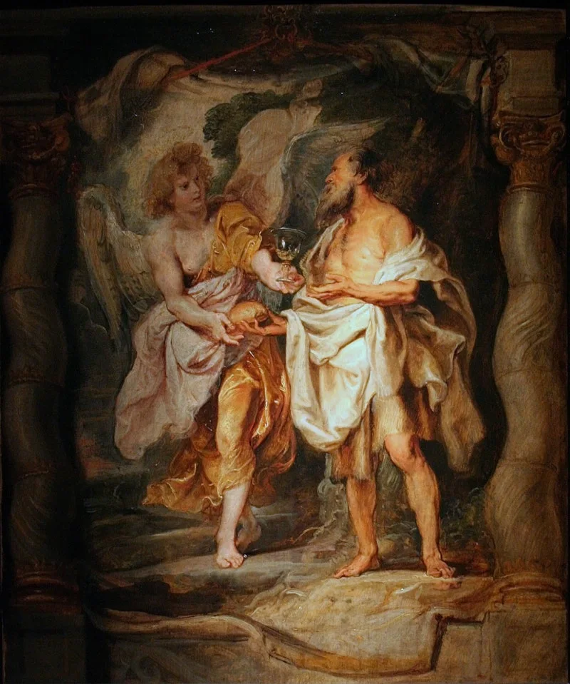 엘리야가 보니 머리맡에 숯불에 구운 빵 한 덩이와 물 한 병이 있었다. 그는 그것을 먹고 마신 후 다시 잠이 들었다.