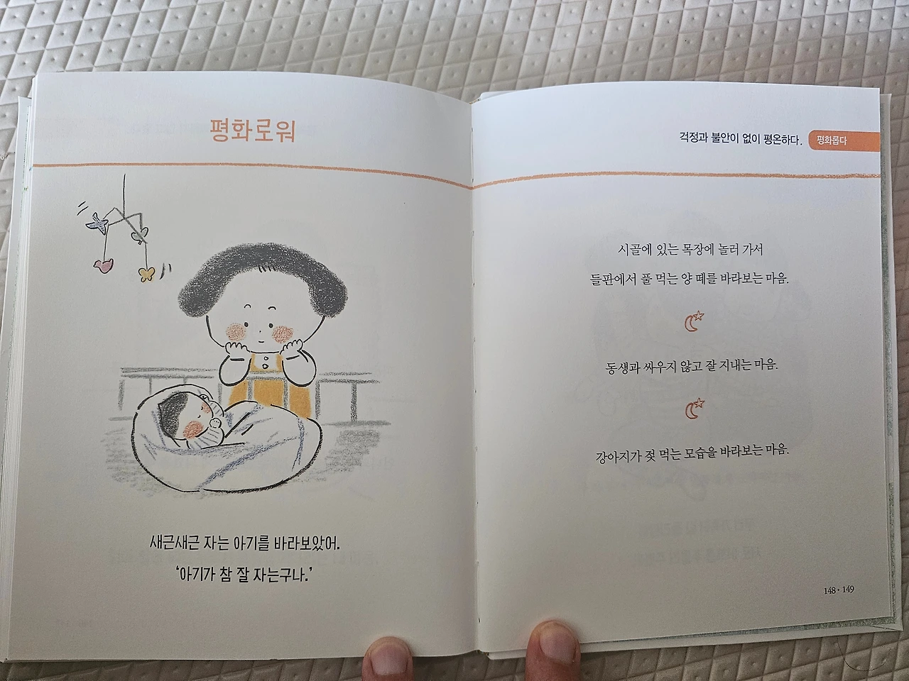 난 스무 살부터 난 항상 마음의 평안을 원했다. 잔잔한 호수처럼 마음의 어떠한 파동이 없는 고요한 상태. 아니 파동이 있더라도 은은하게 울려 퍼져서 마음에 '조용한' 울림이 있는 그런 상태. 자연과 벗 삼아서 마음 치유되는 그림을 상상했다. 큰 딸은 이 감정에 대한 설명을 읽어보며 '정말 아빠가 좋아하는 것들이네?' 하고 공감해 주었다. 벌써 이 만큼이나 컸구나 너.. (조리원에서 큰 딸을 안았을 때는 두 손, 아니 한 손과 내 팔을 이용해서 그녀를 안을 수 있을 정도로 작았다. 발은 엄지 손가락만 했고.)