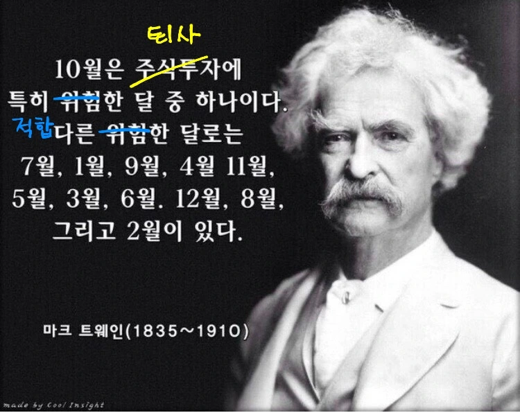 시간은 자신감과도 관련 있었다. 30대 후반인 내 경험으로는 한 살 한 살 더 먹을수록 도전하고자 하는 마음은 작아지고 두려움은 더 커졌다. 그러지 않으려고 노력하는 나임에도 그렇게 되는 것은 어쩔 수가 없었다. 10년 뒤의 내가 후회하지 않으려면 지금 무엇이든 도전해봐야 했다. 주식투자에 위험한 달을 말하는 아래 유명한 주식짤처럼 모든 순간이 다 위험하다. 그럴 바엔 빨리 경험해 보고 다시 회복할 수 있는 기회를 얻을 수 있는 가장 어린 날을 놓치지 않아야 했다. 지금이 내 인생에서 가장 어린 때다. 그래서 내가 퇴사하기로 마음먹은 그 순간, 그 시점을 내 퇴사일로 결정했다.