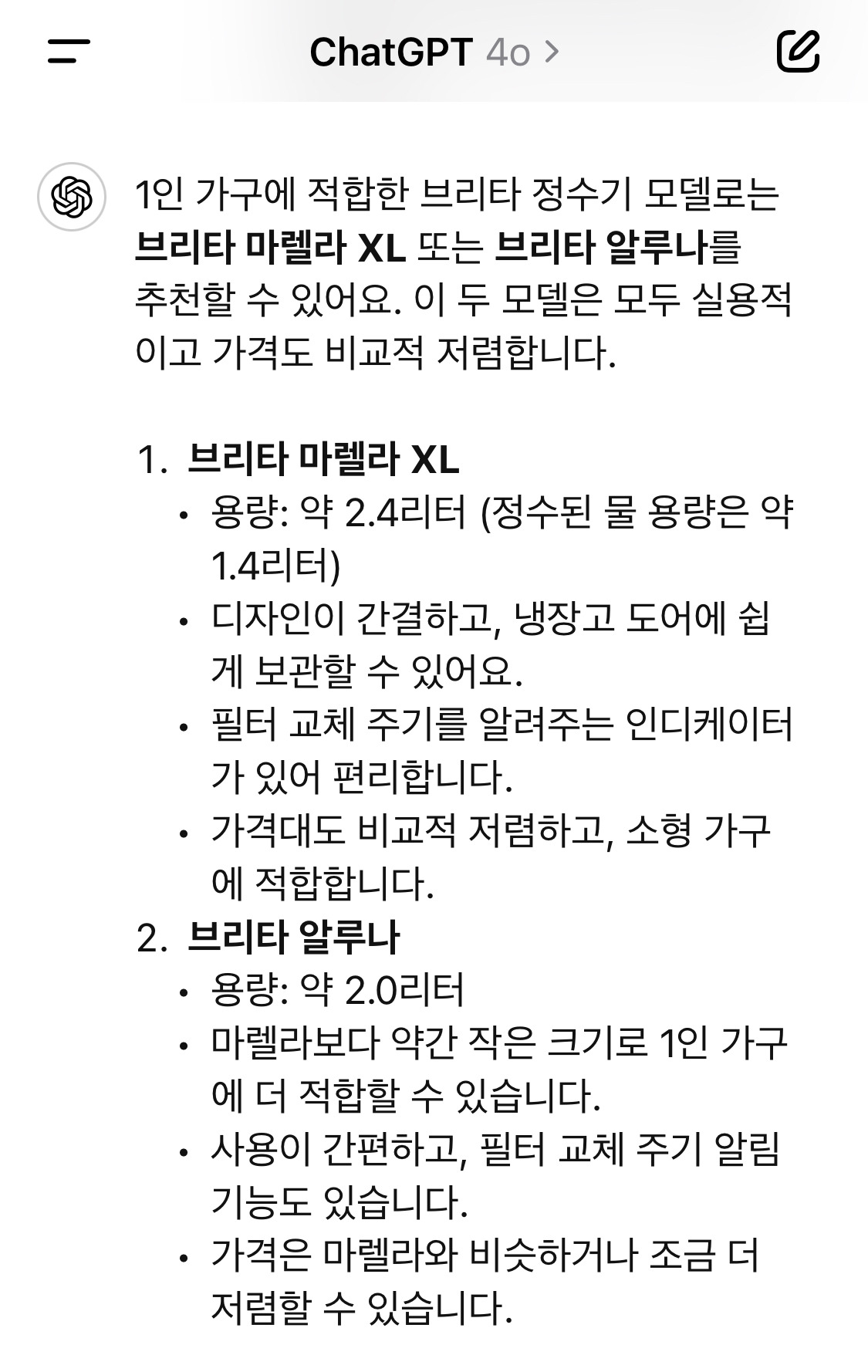 솔직히 물이 다른 것에 비하면 그렇게 비싼 것은 아니었다. 그래도 정수기는 여전히 과했다. 렌털 구독형은 최소 2~3만 원대였고 주방도 좁아 놓을 곳도 없었기에 정수기는 제외했다. 퇴사 전 F&B 트렌드 조사하다가 지나친 브리타 정수기가 떠올랐다. 자료에서 본 이 정수기는 페트병 생수보다는 좀 더 친환경적으로, 간편하면서도 수돗물 특유의 냄새를 없애준다는 것이 요지였다. 친구 자취방 냉장고 안에서 본 브리타 정수기도 생각났다.