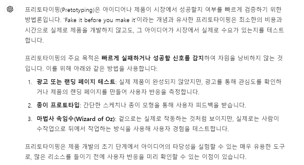 예를 들어, 코인 세탁소에서 사용할 수 있는 세탁물을 접어주는 기계를 팔고 싶은데 비싼 돈 들여 개발해서 만들어 놓고 안 팔리면 손해가 막심하다. 이때 프리토타이핑 과정을 거치면 개발비를 아낄 수 있다. 기계 대신 기계인 척을 하는 거다. 기계 옆에 숨겨진 공간을 설치해 구멍으로 세탁물을 넣으면 기계가 돌아가는 것처럼 녹음된 기계음을 틀고 안에서 사람이 세탁물을 개서 다시 구멍으로 건네주면 된다. 이미 상품이 만들어진 것마냥 시장의 니즈를 파악할 수 있다. 이미 많이 알려진 방법이지만 나같이 처음 창업을 접하는 사람에게는 신박하고 유용한 접근이었다. 실제로 교육 수강생 중에서도 2년 동안 퇴근 후 개발한 앱이 시장 반응이 없어 그간의 고생이 물거품으로 돌아갔다는 분도 더러 있었다.