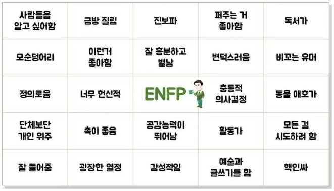 후보는 여러 가지 활동을 했다고 답했다. 오픽 AL달성, 유튜브 개설, 바디 프로필, 꽃꽂이 자격증 등에 도전했다고 했다. 답변은 낮은 점수를 받지 않았다. 생산적인 일을 벌이고 도전하는 것을 좋아하는 것처럼 보였기 때문이다. 확인사살을 하기 위해 추가 질문을 하나 했다. "혹시 MBTI가 ENFP인가요?" 후보자는 맞다고 했다. 보통 ENFP는 새로운 일을 벌이기 좋아한다. 열정적이고 공감을 잘한다고 하며 사교적이기도 하다. 한 가지 일을 끝내기도 전에 몇 가지 다른 일을 벌이고 계획성이 없다는 단점이 있기는 하다. ENFP라는 MBTI 결과 하나로 많은 성향이 예측됐지만 면접장에서 지나친 억측은 안 됐다. 그러나 새로운 일에 도전하는 것을 좋아한다는 것은 의심할 수 없는 사실이었다.