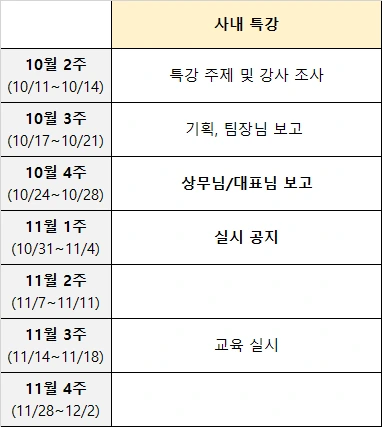- 사내강사 액션플랜 멘토링 → 사내 SME 사전 인터뷰를 통해 실제 사례를 도출하고, 외부강사 교육 프로그램에 적용