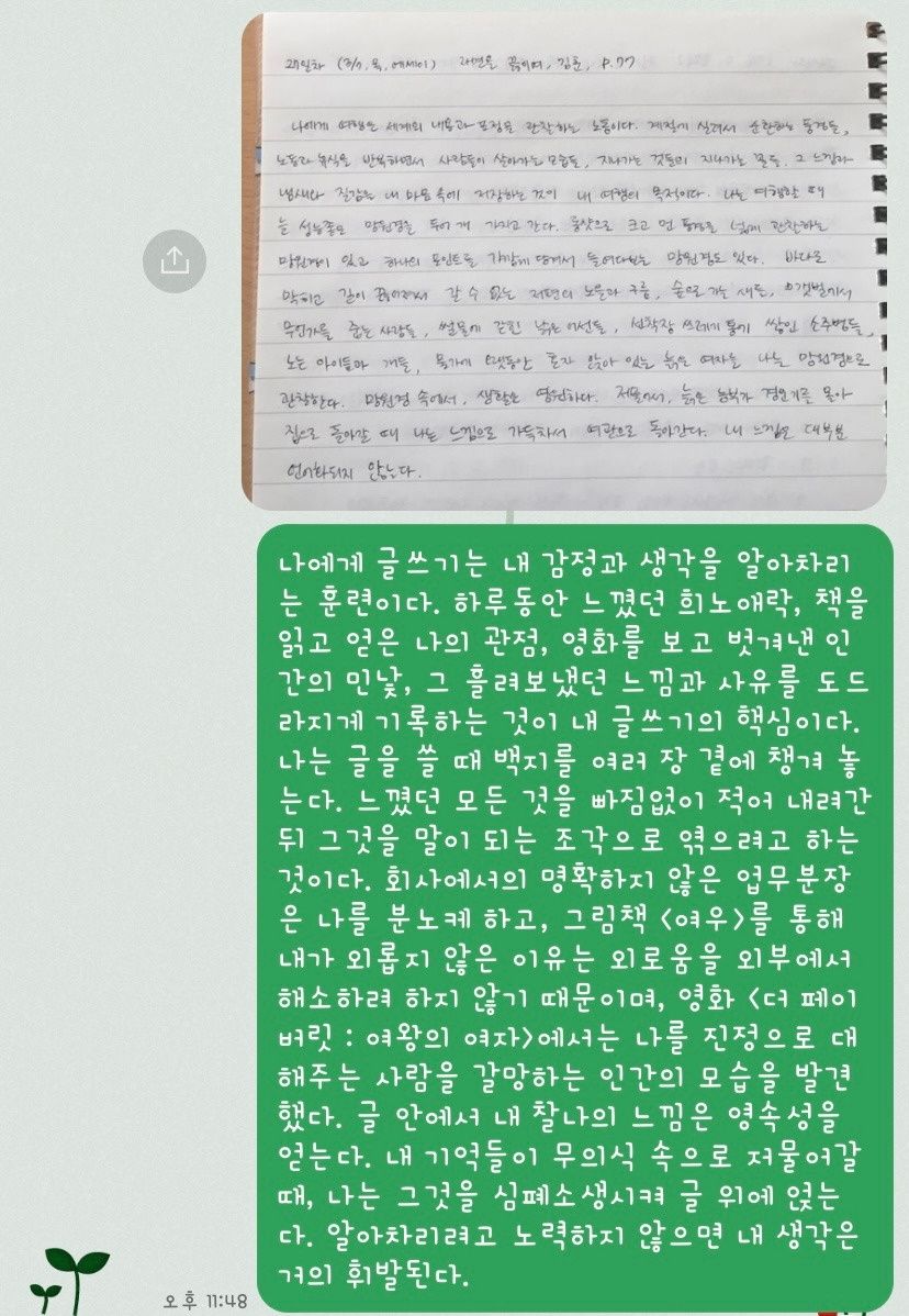 이 강의에서는 필사를 독특한 방식으로 해요. 일단 필사 대상 글 자체의 길이도 짧아요. 한 문단만 올려주세요. 이것을 완전히 똑같이 베껴 쓴 다음에 자기식으로 바꿔서 다시 글을 써보는 거예요. 단어나 표현 정도만 내 언어를 써주는 거에요. 선생님이 오늘의 필사할 문단을 올려주시면 아래처럼 똑같이 필사를 한번 하고, 여기에 있는 문장 구조를 활용해서 작문을 해요. 내 단어와 표현을 꺼내 활용하는 것이죠. 그리고 단톡방에 올려요. 아래는 제가 실제로 과제로 올린 내용이에요.