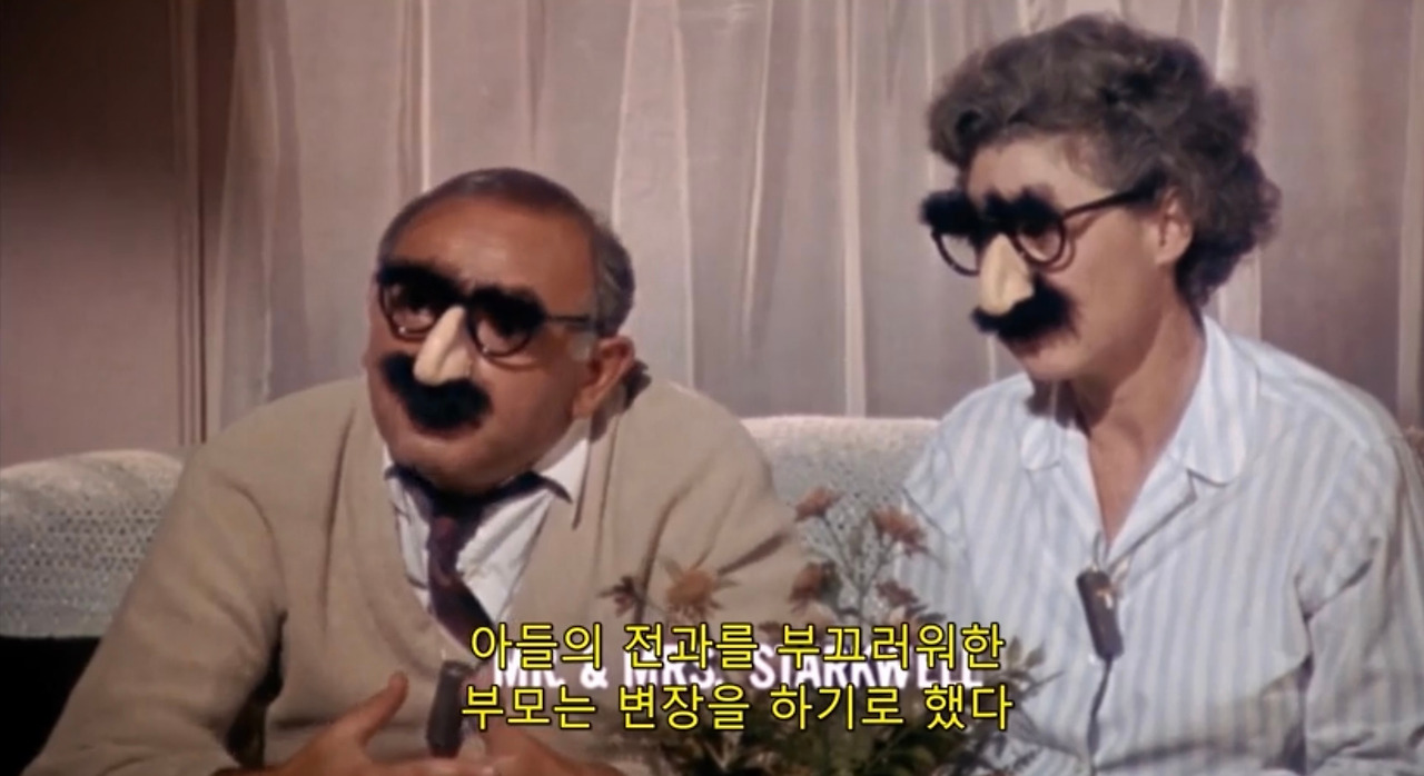 특히 사실상 첫 연출작인 <돈을 갖고 튀어라>(1969년 작)을 보면서 병맛 같은 연출이 마음에 들었다. 주인공 버질은 일생 전체를 범죄로 채우는 범죄자다. 영화에서는 버질의 부모님을 찾아가 그의 어린 시절에 대해 묻는다. 그런데 부끄럽다고 눈코입을 가려준다. 눈코입을 가리는 데에는 여러 가지 방법이 있을텐데 아래 사진처럼 우스꽝스러운 털이 붙은 안경을 씌워 놓았다. 유치하지만 웃지 않을 수 없었다. 아이폰 이모지 디자이너도 우디앨런의 팬인가?