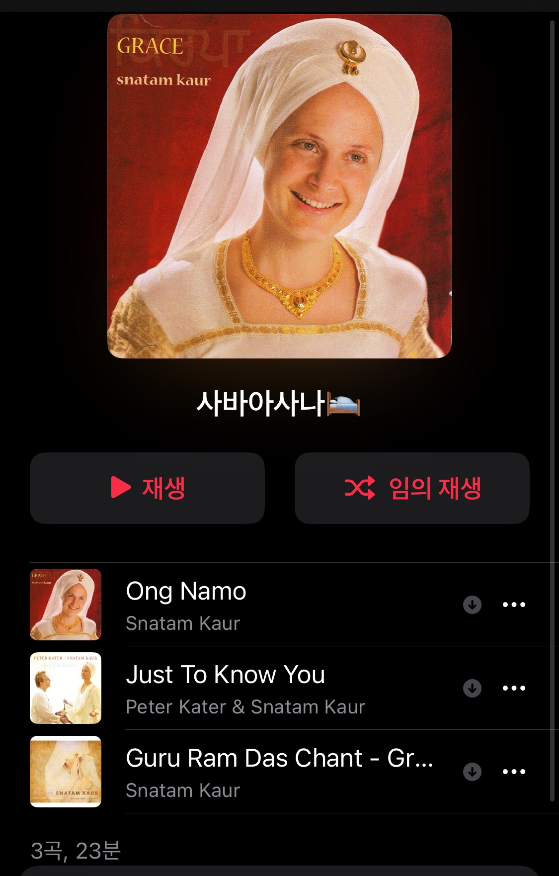 요가에서 배운 점은 큰 숨을 들이마셨다가 내쉴 때 스트레스가 해소됐다는 점이었다. 이를 응용해 보기로 했다. 요가를 하기 싫은 날도 있었기 때문이다. 숨을 쉴 명분이 필요했다. 한 가지는 그냥 사바아사나 음악을 들으면서 숨쉬기를 하는 것이다. 내가 특히 좋아했던 사바아사나 음악을 듣는다. 요가 선생님들이 틀어줬던 음악 중 마음에 들었던 것을 유튜브에서 뒤져 어렵게 찾았다. 스트레스가 올라오면 지하철에서도 듣고 길거리에서도 듣는다. 특히 지옥철에서 사람들과 부딪쳐 짜증이 올라올 때 필수다.ㅠ 스트레스가 많은 날은 평소라면 그냥 지나칠 작은 부딪침에도 짜증이 쉽게 올라온다. 그때 최애 가수 스나탐 카우르 선생님의 플레이리스트를 비상약 찾듯이 꺼낸다. 그리고 에어팟을 귀에 꽂고 눈감고 심호흡을 한다. 그 순간 지하철은 요가원이 된다. 마음도 차분해진다.