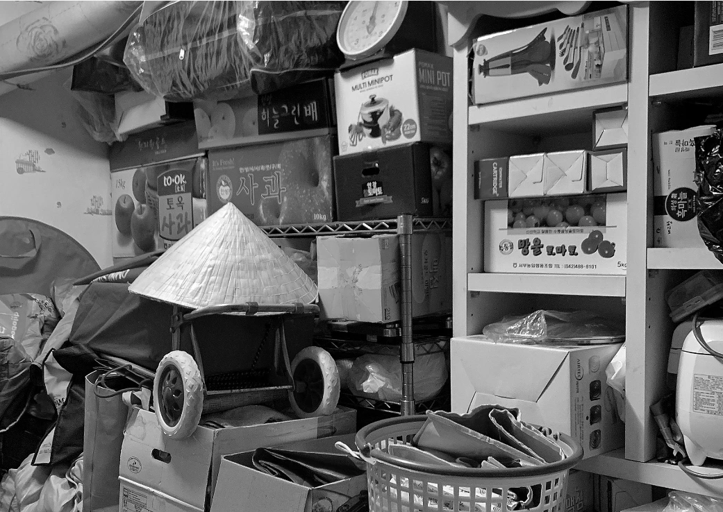 할머니에게는 집이 곧 창고다. 어디서 얻어왔는지 모를 물건들이 온 집안을 둘러싸고 있다. 포장 박스와 물건은 대부분 일치하지 않는다. 예를 들자면, 사과박스 안에 사과는 없고 엉뚱하게 반찬통만 가득하거나, 책장에 책은 없고 자질구레한 박스들이 제 몸을 이리저리 구겨 넣고 있다.
