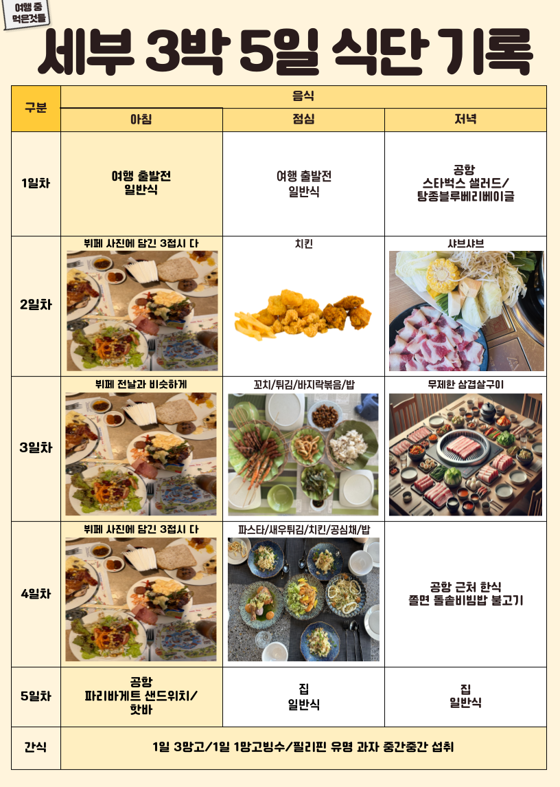 지난 월요일 3박 5일간 세부 여행에서 먹은 것이다.