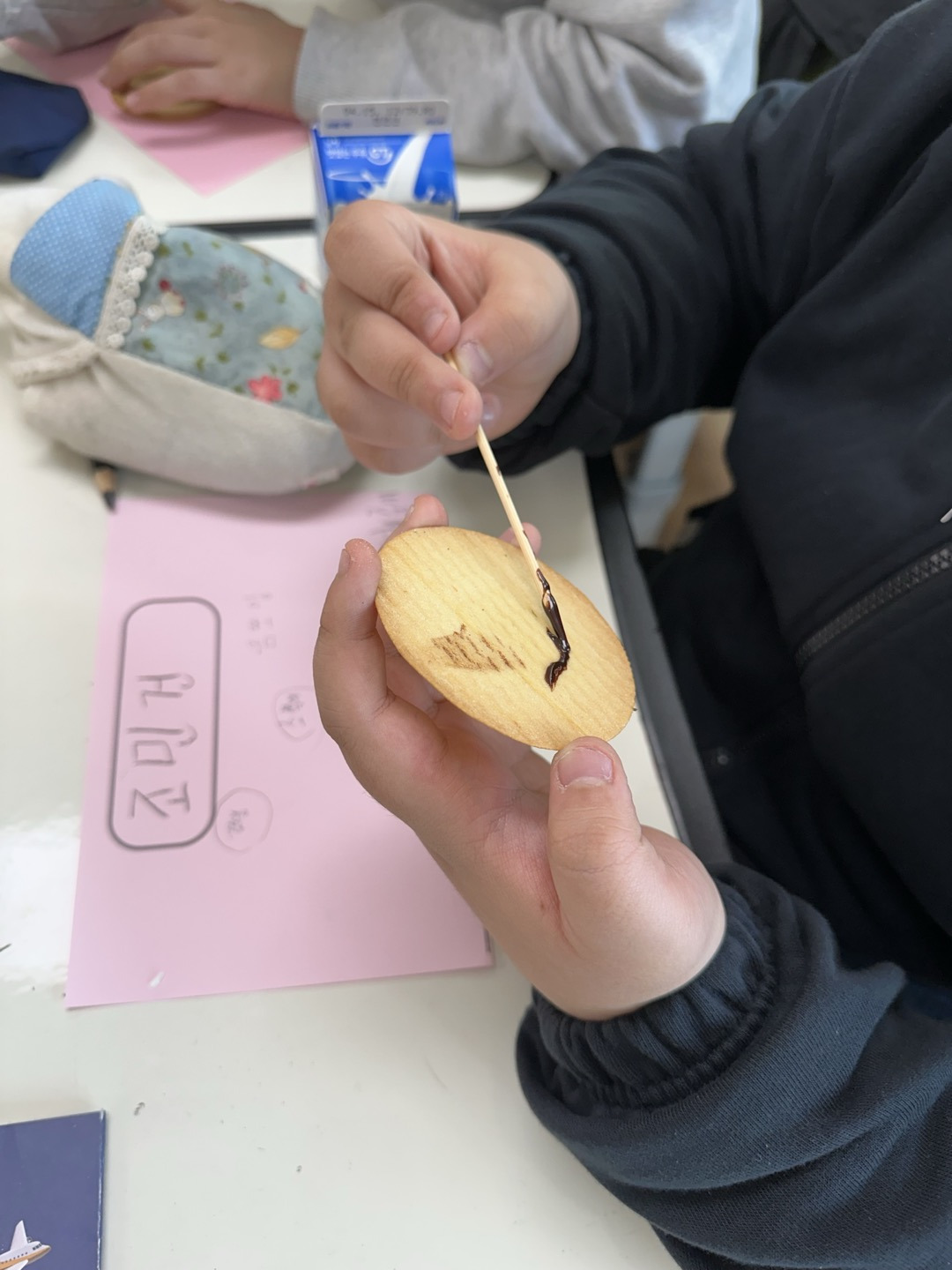 활동 2. 과자와 초코시럽으로 나 표현하기. : 초코시럽을 물감, 나무꼬치를 붓, 과자를 도화지 삼아 내 특징 표현하도록 권하였습니다.